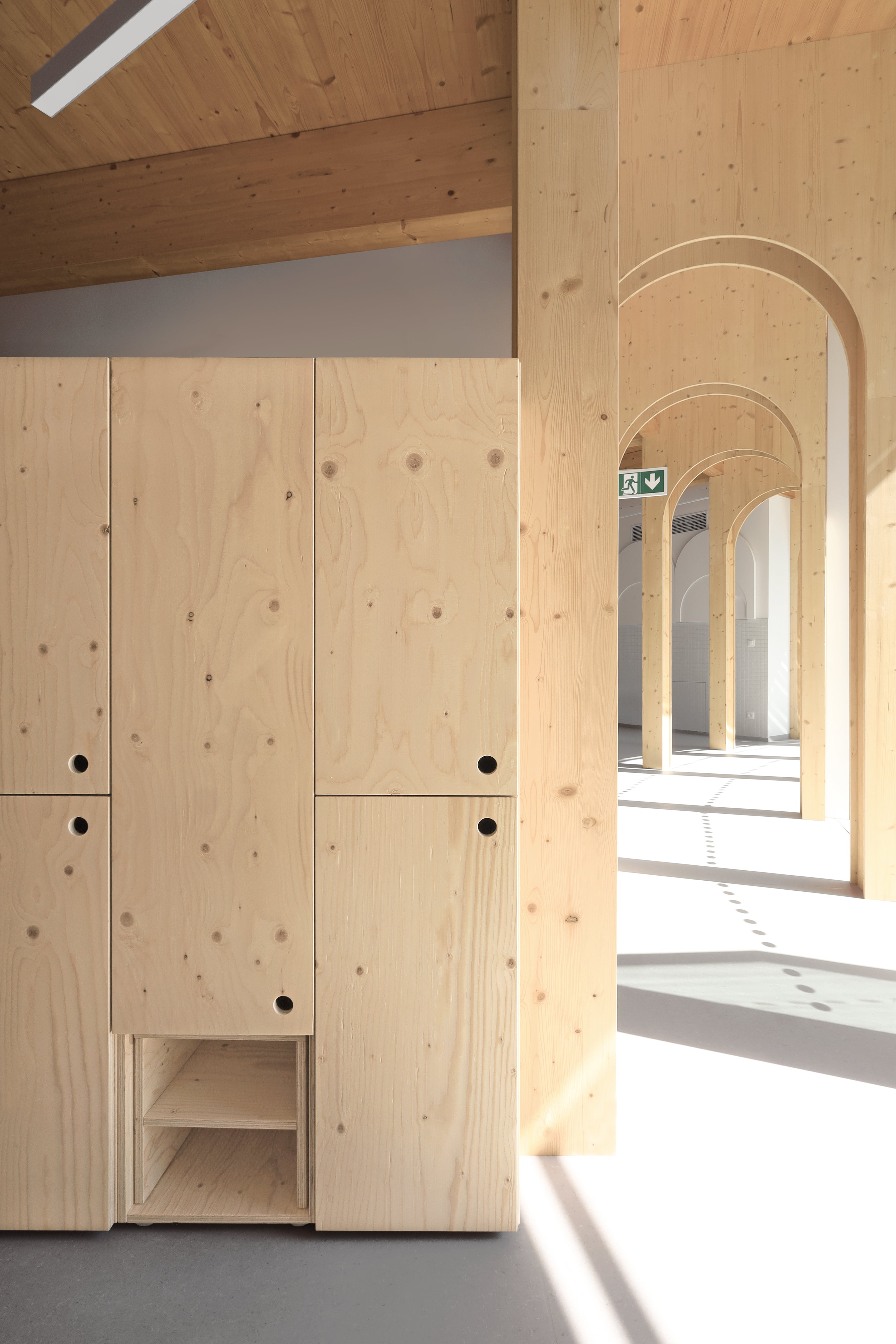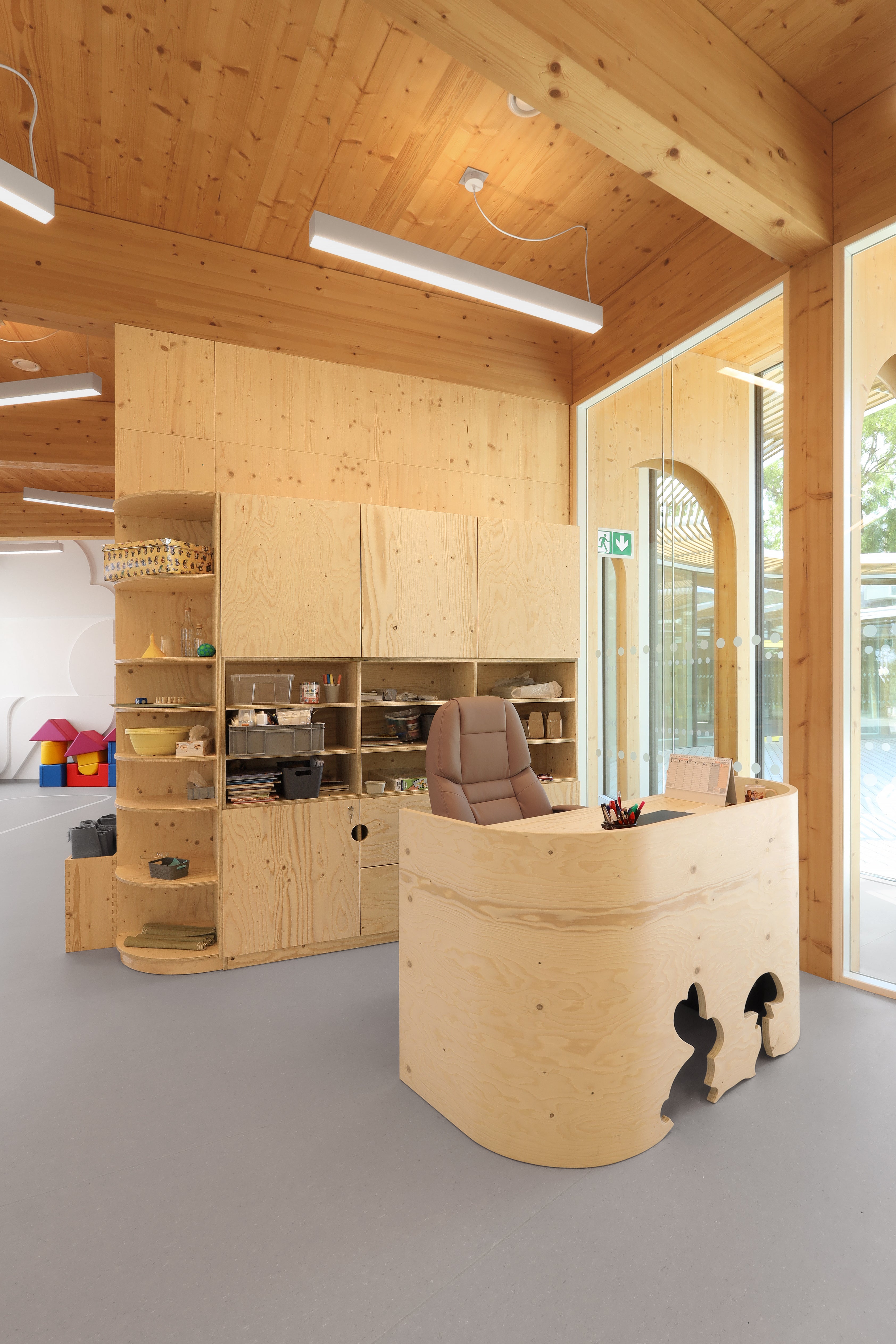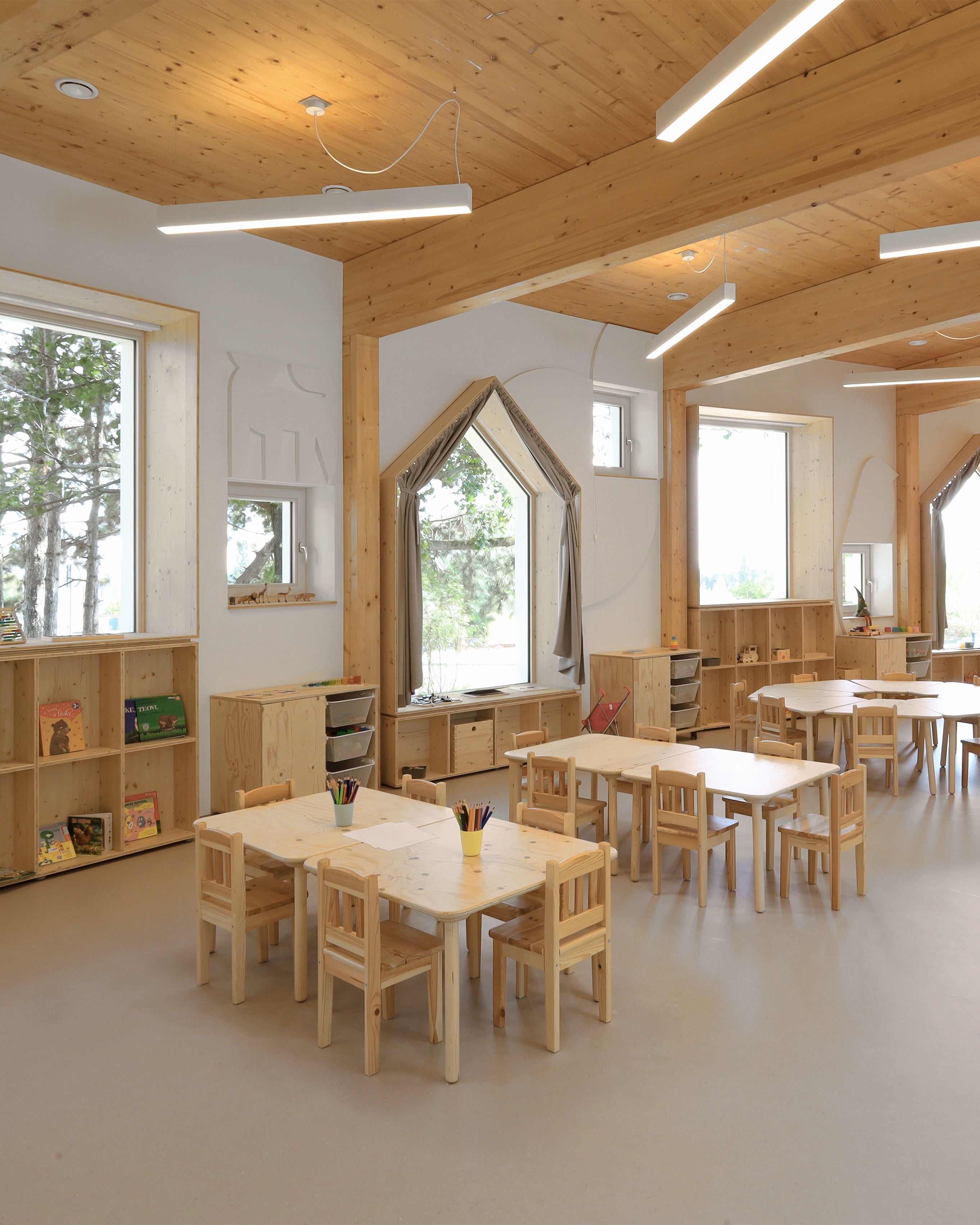 Při vytváření komplexního interiérového zařízení této jedinečné školky jsme dbali na maximální použitelnost a praktičnost všech kusů nábytku – pro děti i učitele.Veškerý nábytek je ošetřen bezbarvým přírodním lakem certifikovaným pro styk s potravinami kvůli bezpečnosti dětí.Bezbarvost jsme zvolili i kvůli filosofii architekta projektu, Petra Kožuška ze studia Patograph Architects, který tvrdí, že jedinými barvami ve školce jsou samotné děti a jejich hračky. Součástí řešení byly stohovatelné postýlky ze smrkové překližky. Z té vznikly i originální posuvné komody a úložné boxy na hračky, komody na malování s unikátním systémem pro sušení výkresů, hravé stoly ve tvaru čtverců a trojúhelníků a jídelní stolky se snadno omyvatelným povrchem. Pro učitele jsme vytvořili designové obloukové katedry a skříně s uzamykatelnými skříňkami a šuplíky.