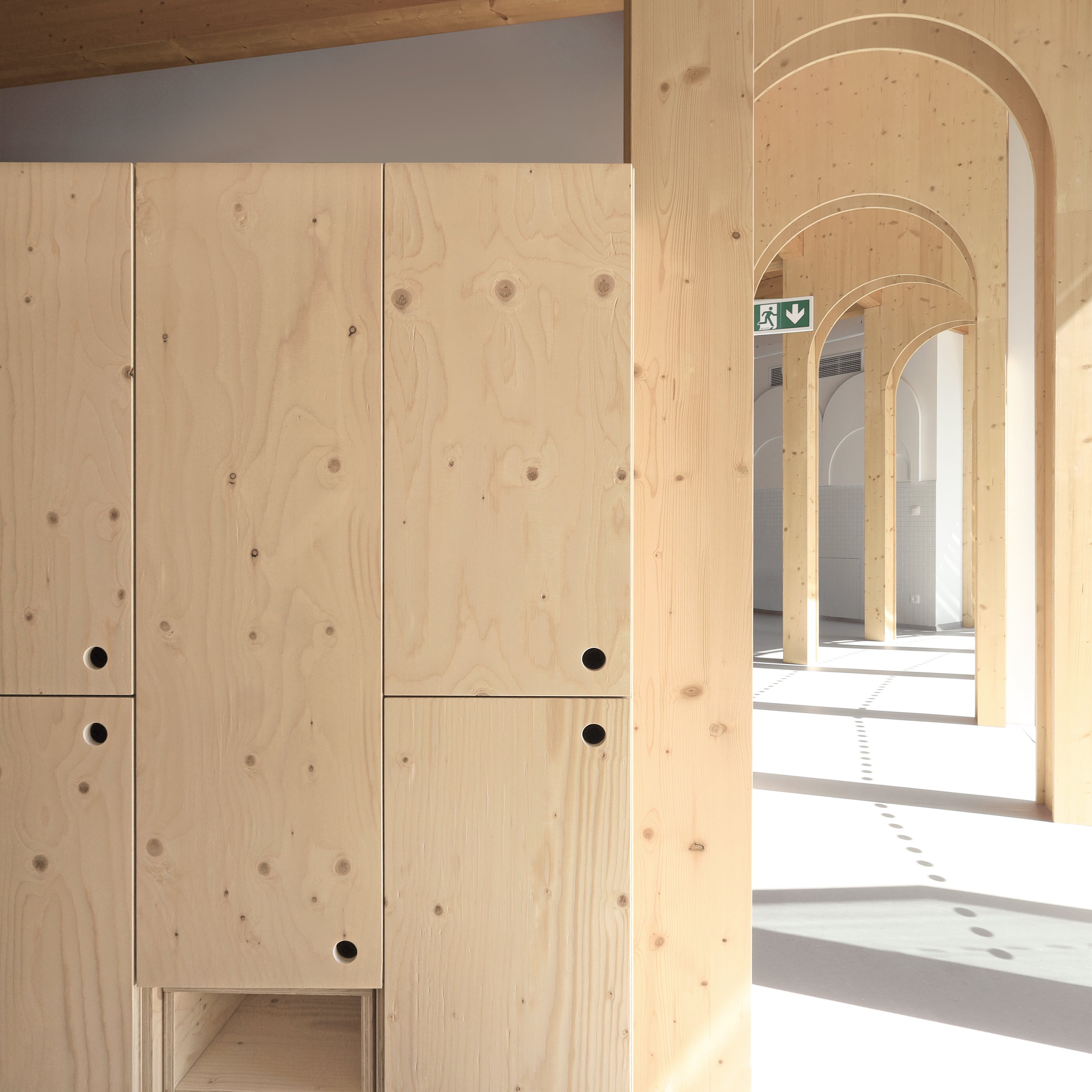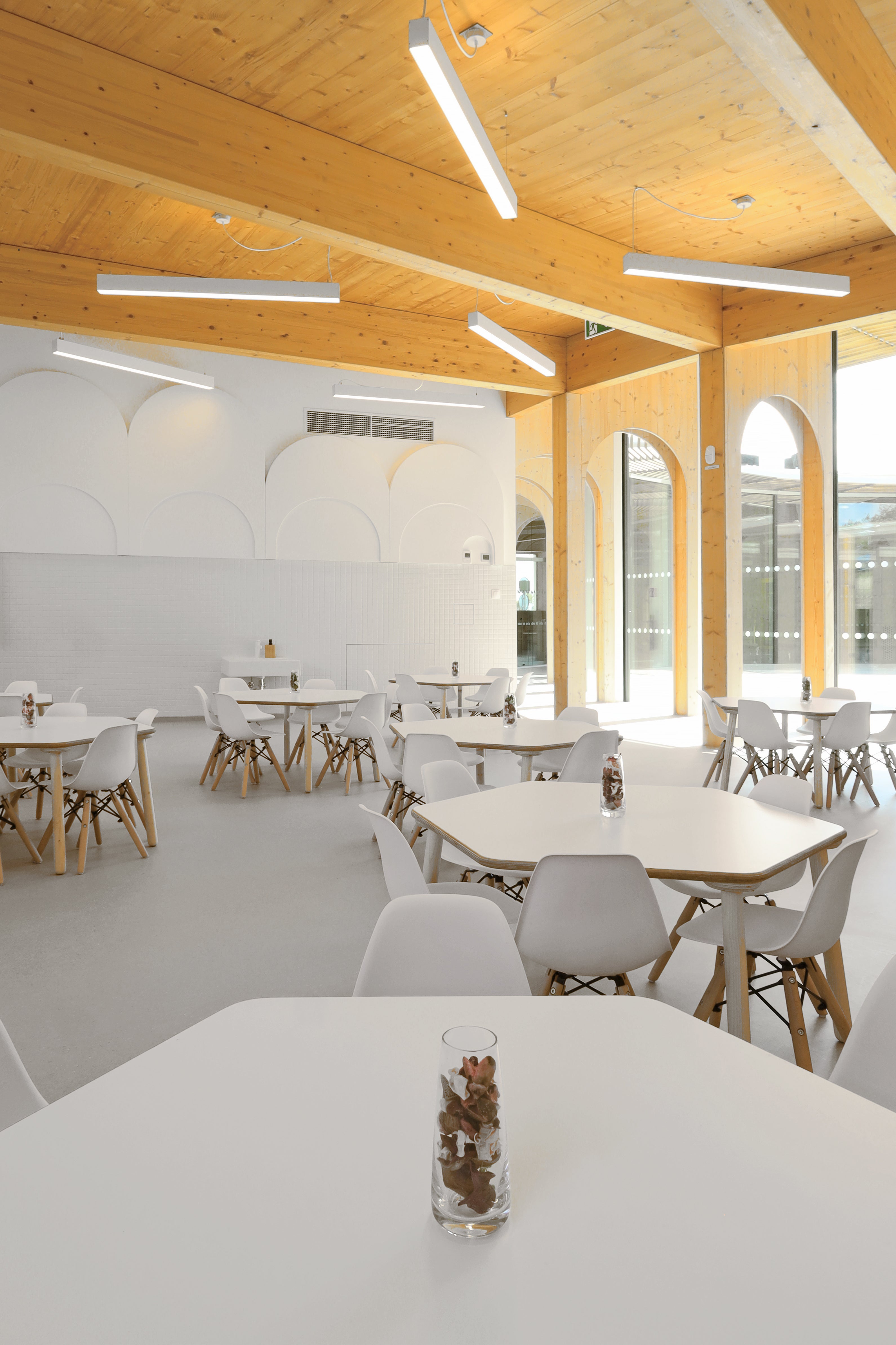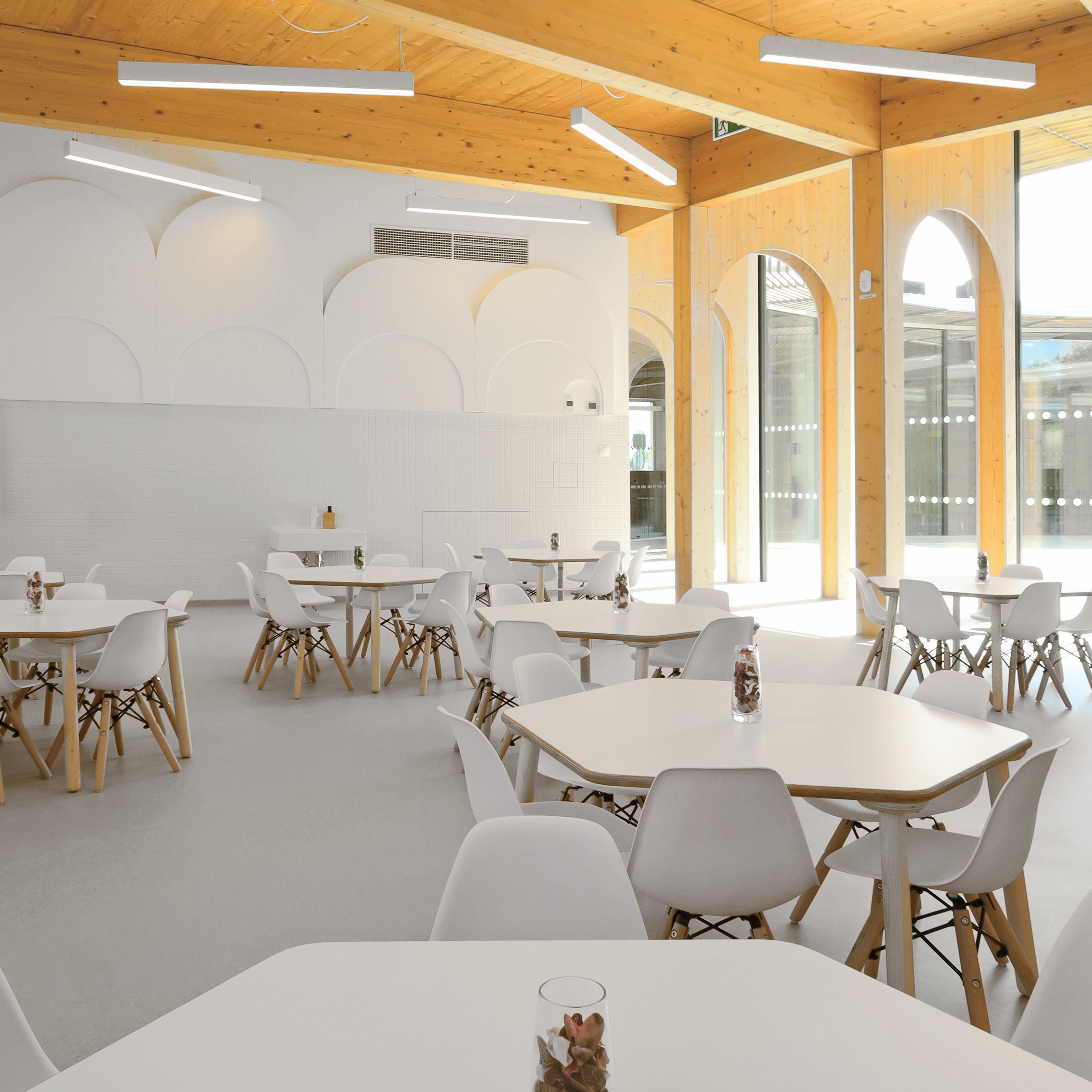 Při vytváření komplexního interiérového zařízení této jedinečné školky jsme dbali na maximální použitelnost a praktičnost všech kusů nábytku – pro děti i učitele.Veškerý nábytek je ošetřen bezbarvým přírodním lakem certifikovaným pro styk s potravinami kvůli bezpečnosti dětí.Bezbarvost jsme zvolili i kvůli filosofii architekta projektu, Petra Kožuška ze studia Patograph Architects, který tvrdí, že jedinými barvami ve školce jsou samotné děti a jejich hračky. Součástí řešení byly stohovatelné postýlky ze smrkové překližky. Z té vznikly i originální posuvné komody a úložné boxy na hračky, komody na malování s unikátním systémem pro sušení výkresů, hravé stoly ve tvaru čtverců a trojúhelníků a jídelní stolky se snadno omyvatelným povrchem. Pro učitele jsme vytvořili designové obloukové katedry a skříně s uzamykatelnými skříňkami a šuplíky.