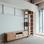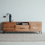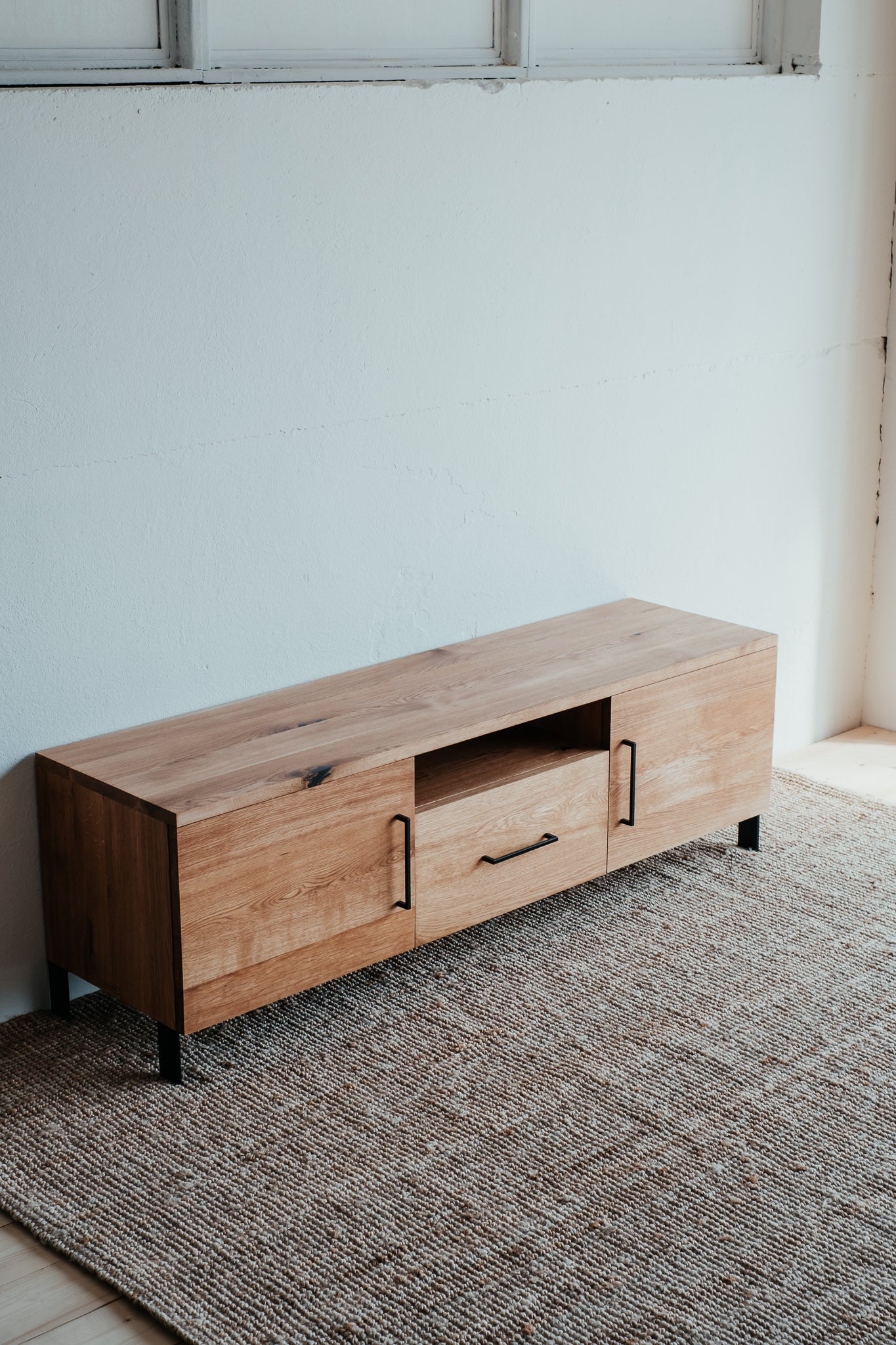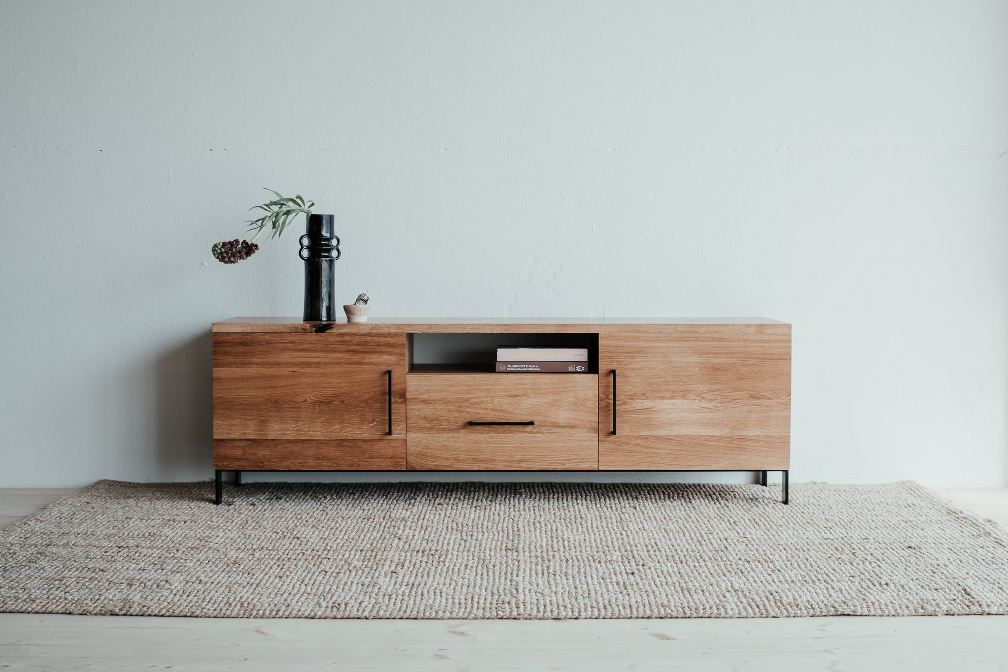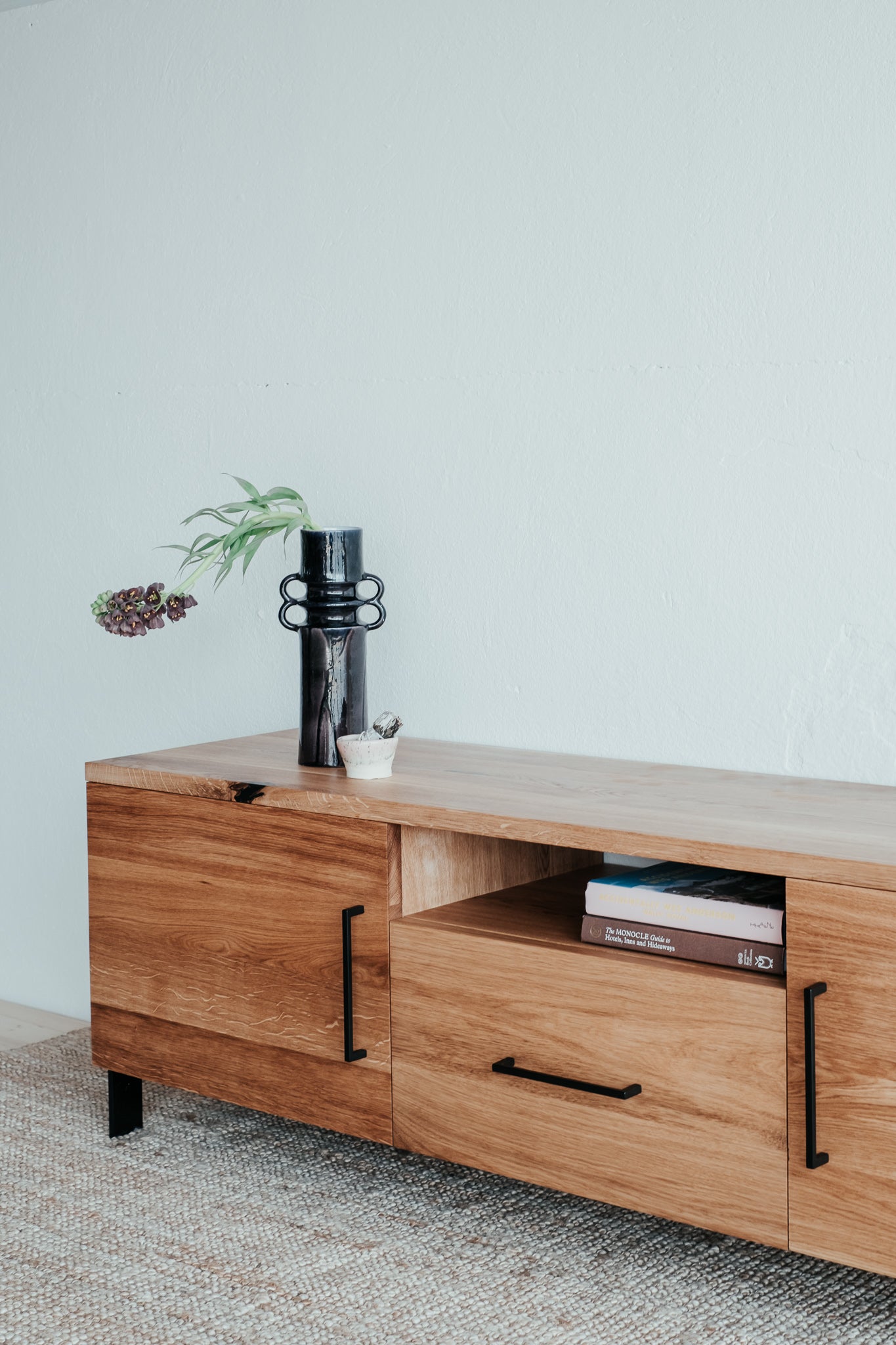 Practical in every detail and every detail perfectly beautiful. The massive TV table made of high-quality oak wood offers a large storage space in the form of two cabinets, a drawer and an open shelf. The beautiful structure of the wood is tastefully complemented by elegant black iron handles.