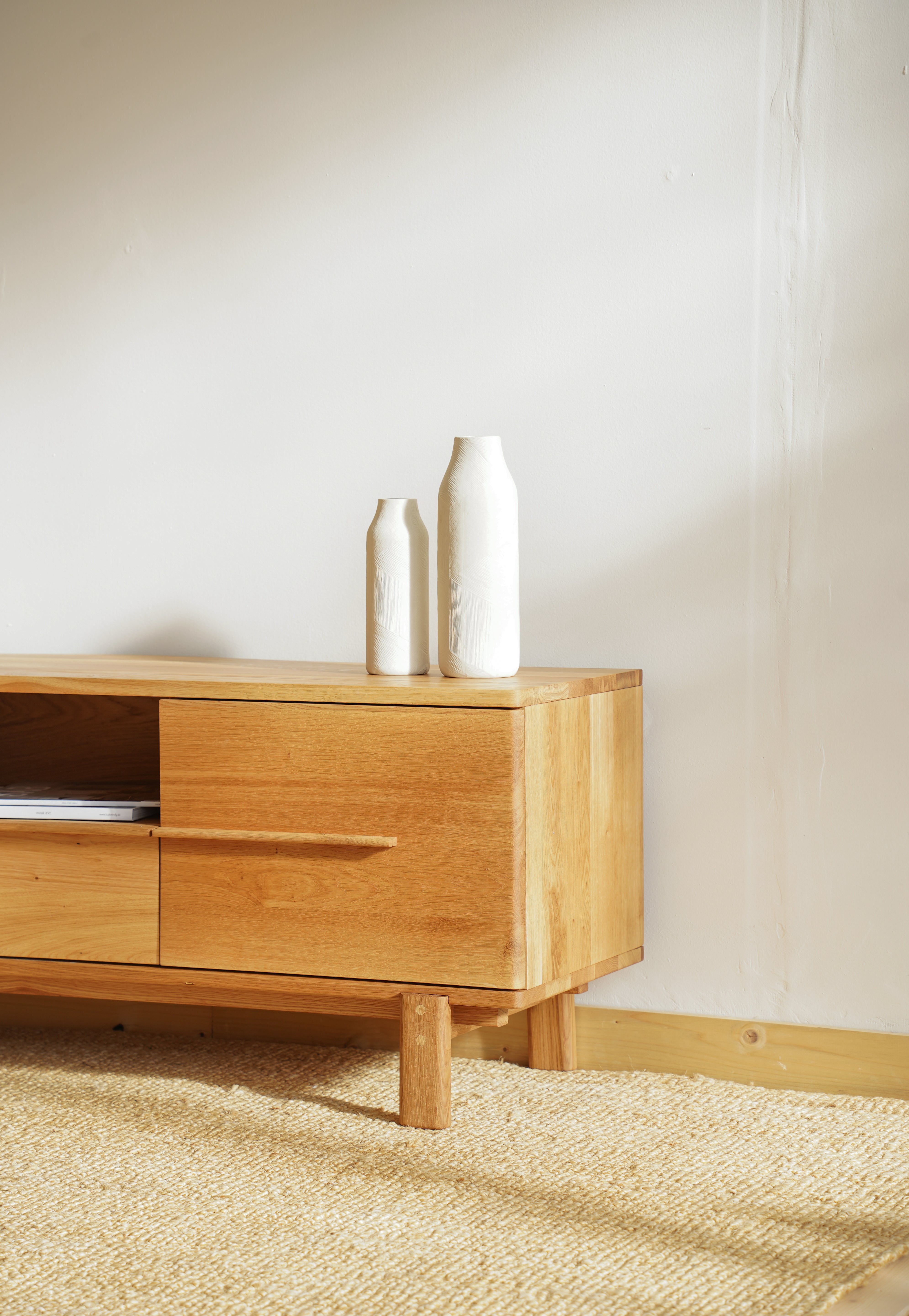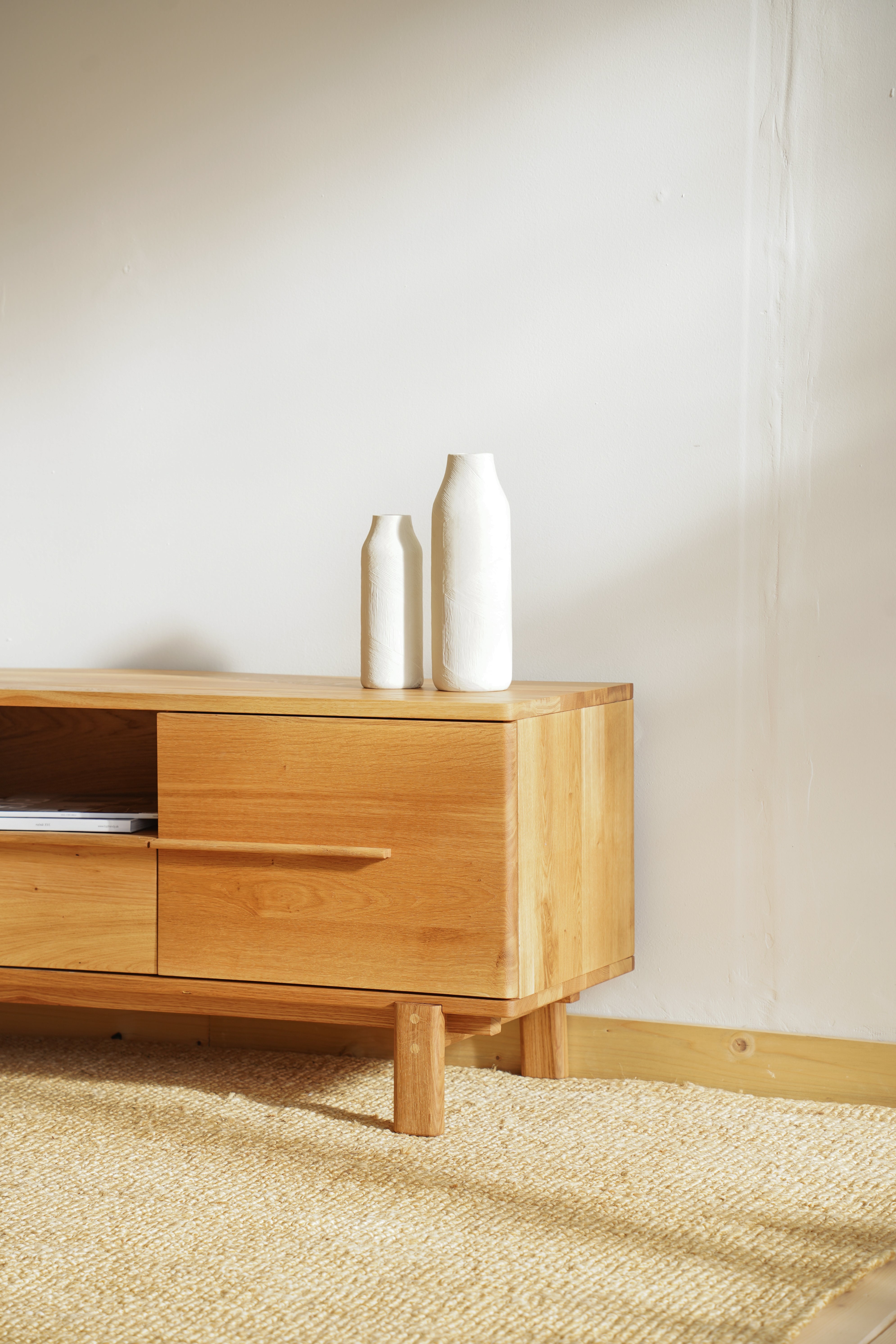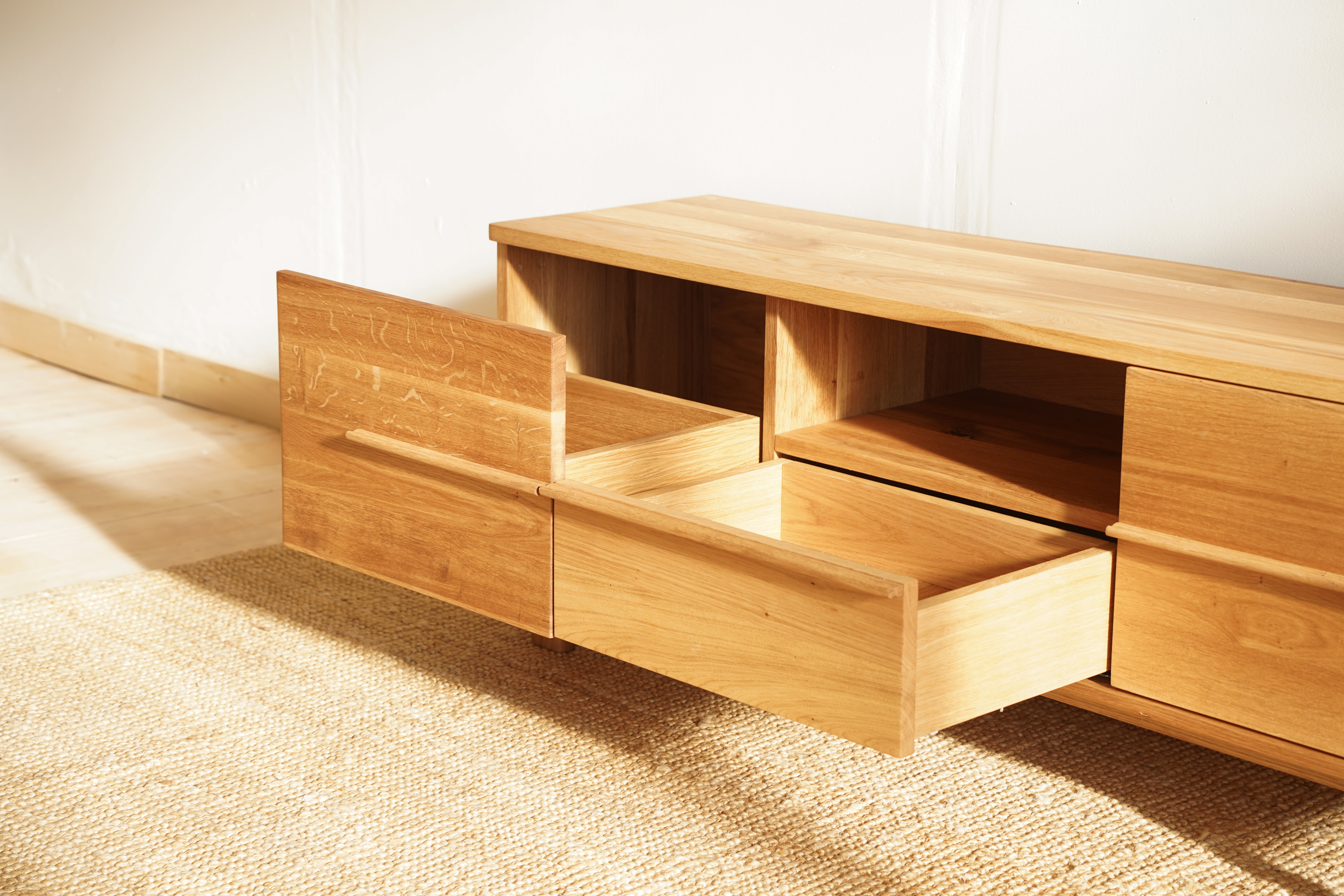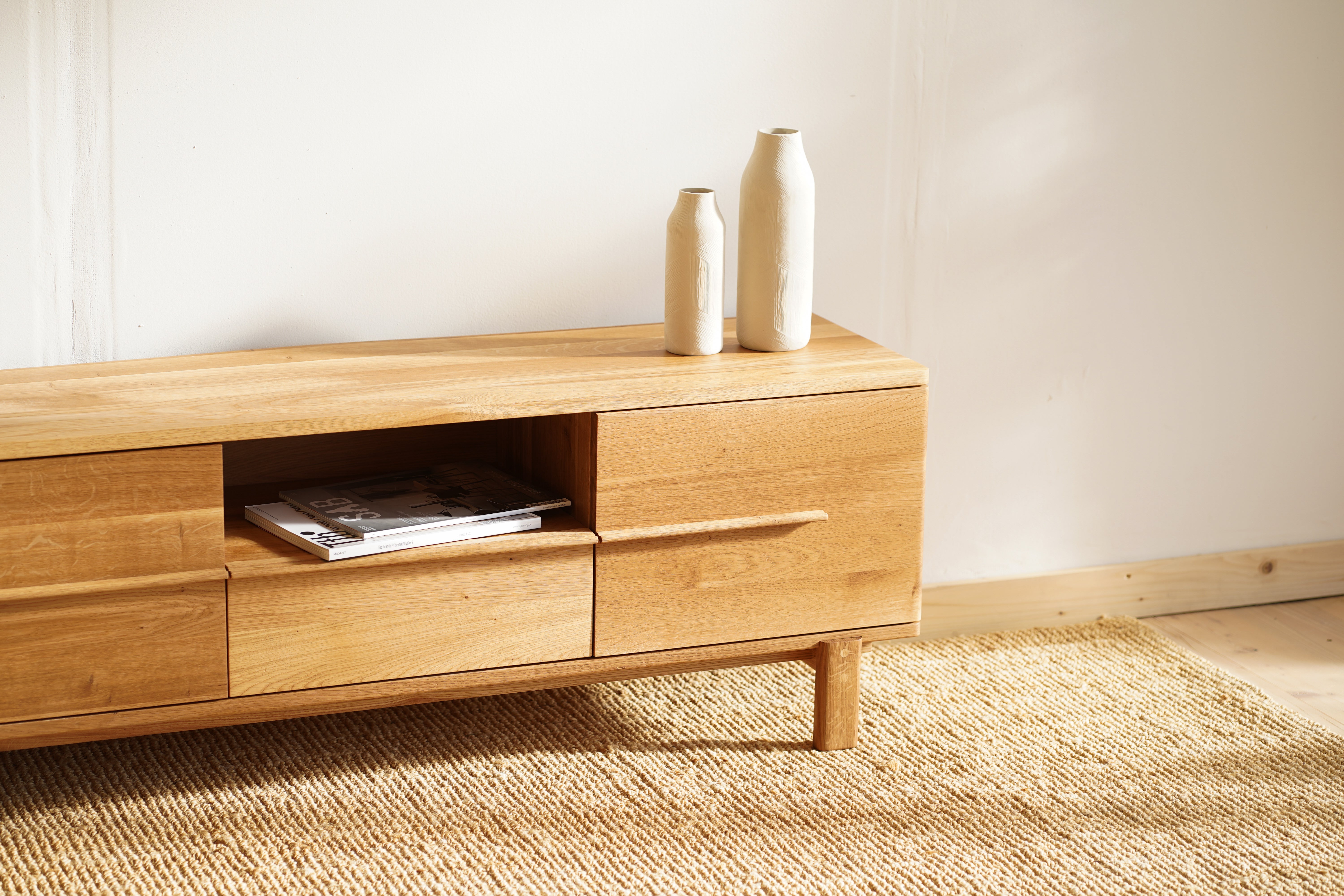 Modern yet with a hint of the past. A beautiful TV table made of solid oak wood, which combines a unique and well-thought-out design, functionality and superior quality. Gently rounded corners, three drawers with a quiet reach and minimalist oak legs will simply delight you.