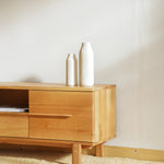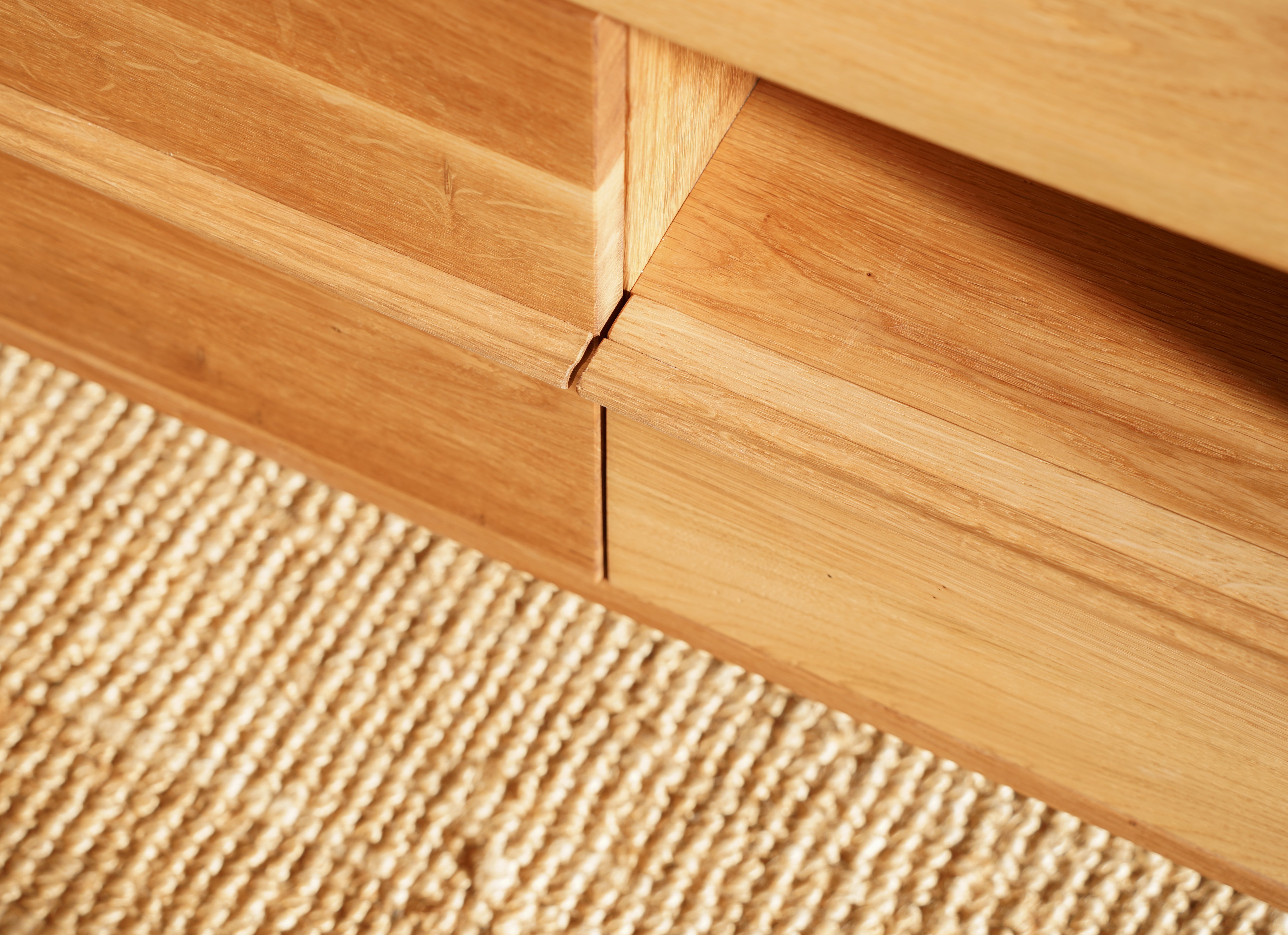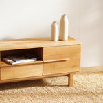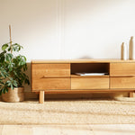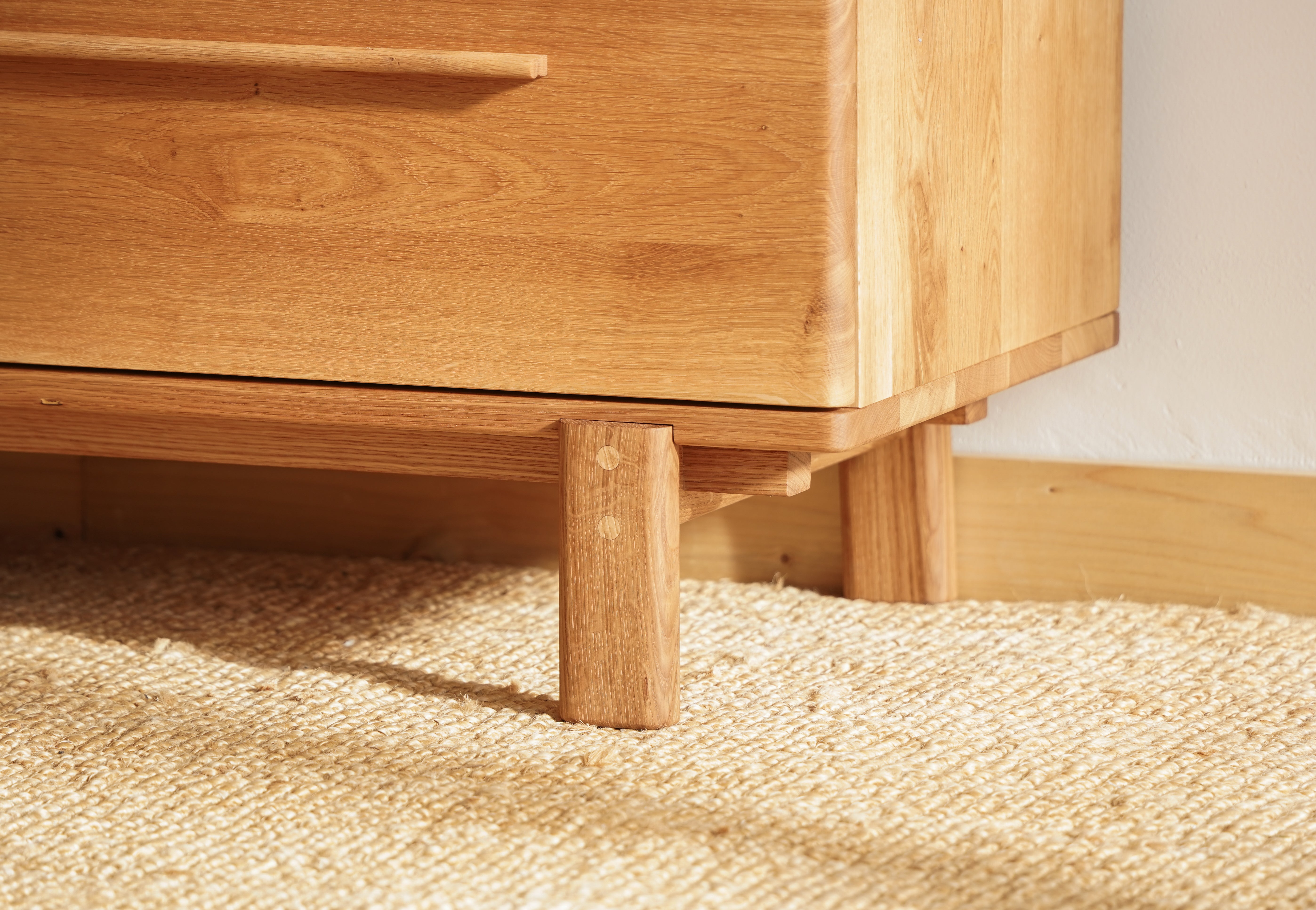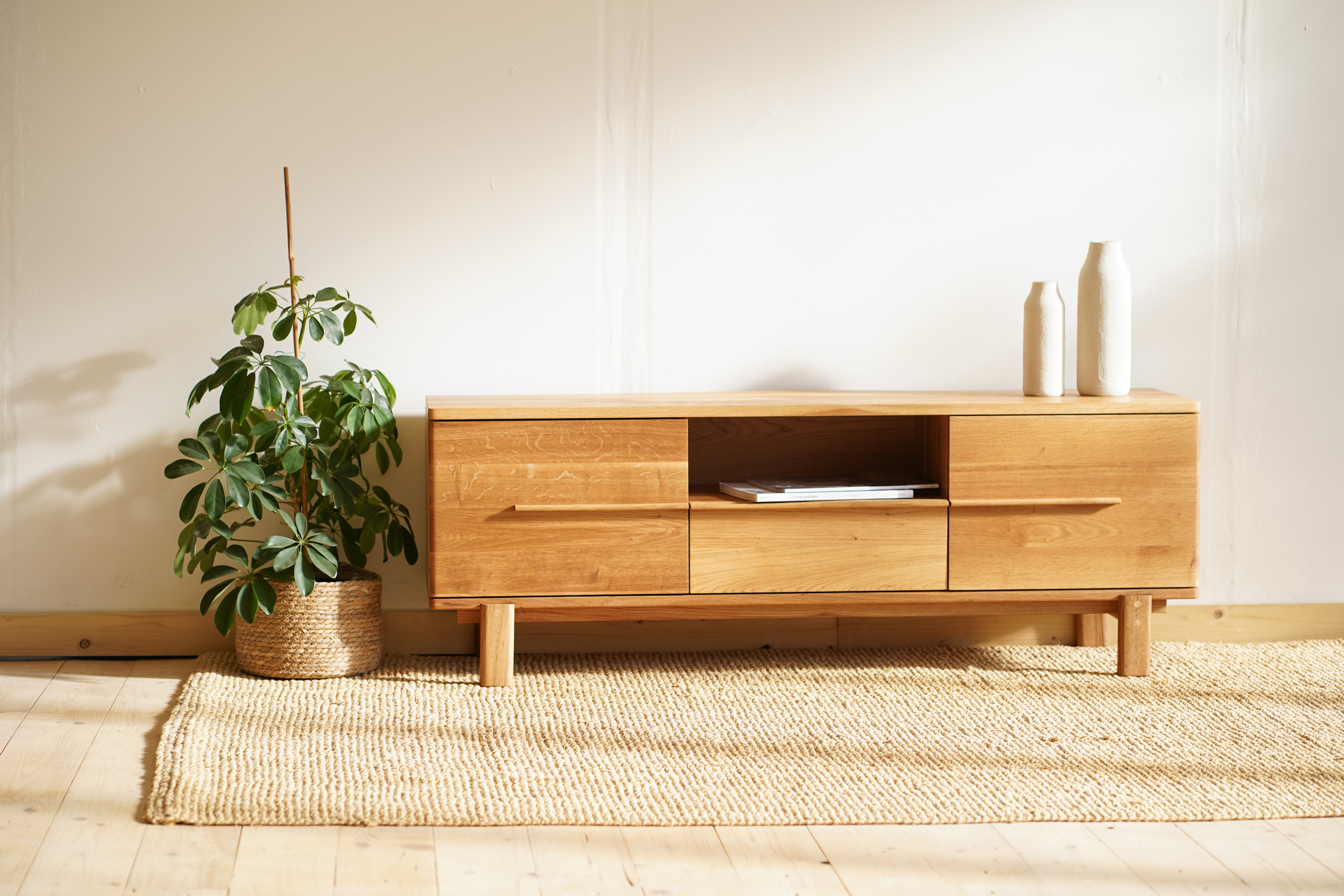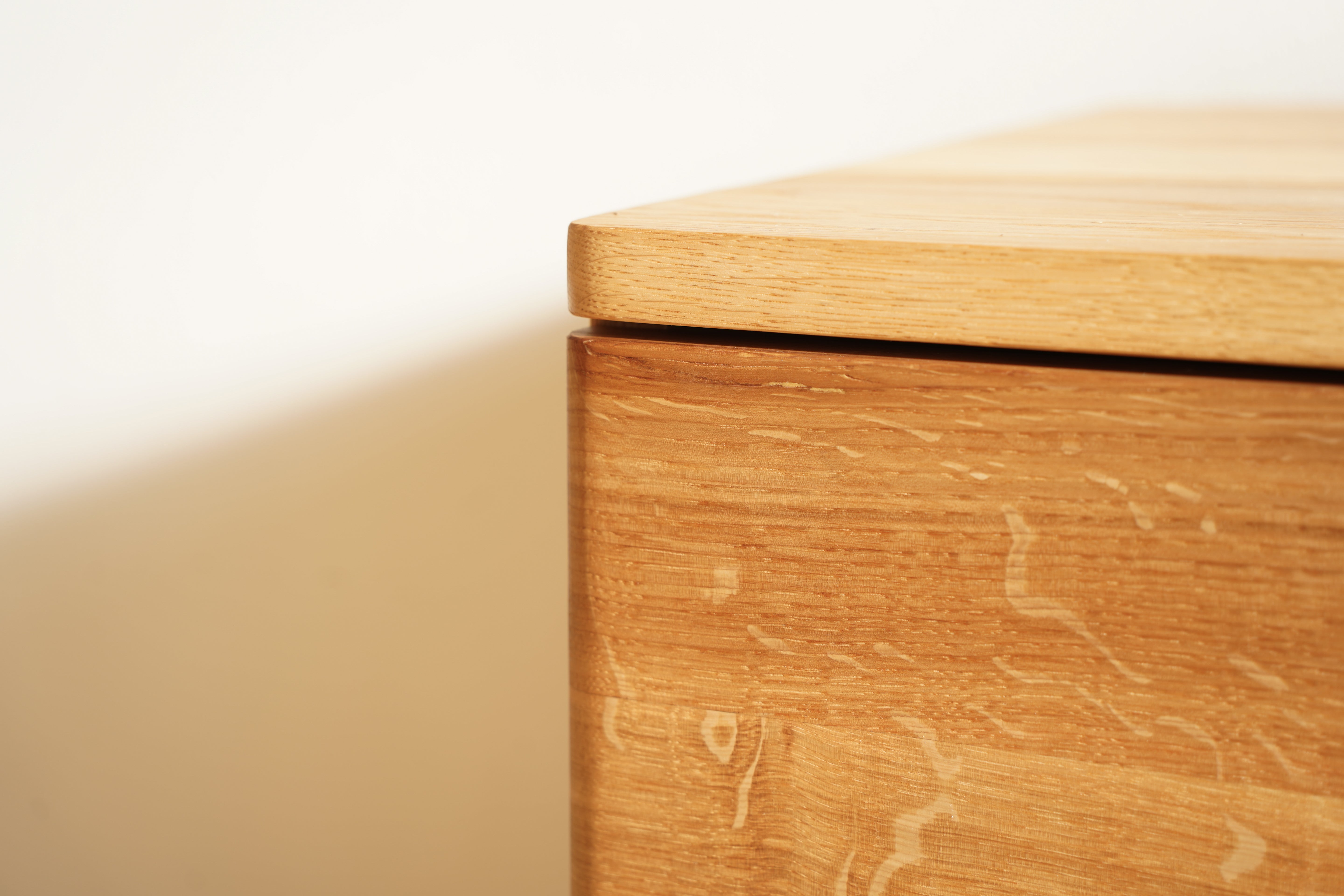 Modern yet with a hint of the past. A beautiful TV table made of solid oak wood, which combines a unique and well-thought-out design, functionality and superior quality. Gently rounded corners, three drawers with a quiet reach and minimalist oak legs will simply delight you.