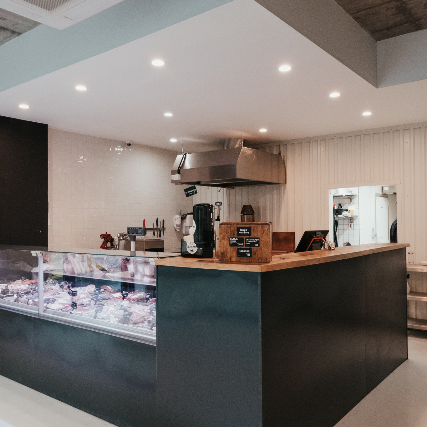 Umocnit raw feeling moderního poctivého řeznictví spojeného s jídelnou bylo zajímavým projektem, do kterého jsme se pustili s chutí. Výsledkem byly masivní dubové desky na stolech, které vynikaly svojí syrovou krásou. K tomu jsme se postarali také o výrobu hlavního pultu a pultu s pípou, které byly laděny do poměrně maskulinního a průmyslového designu provozu.
