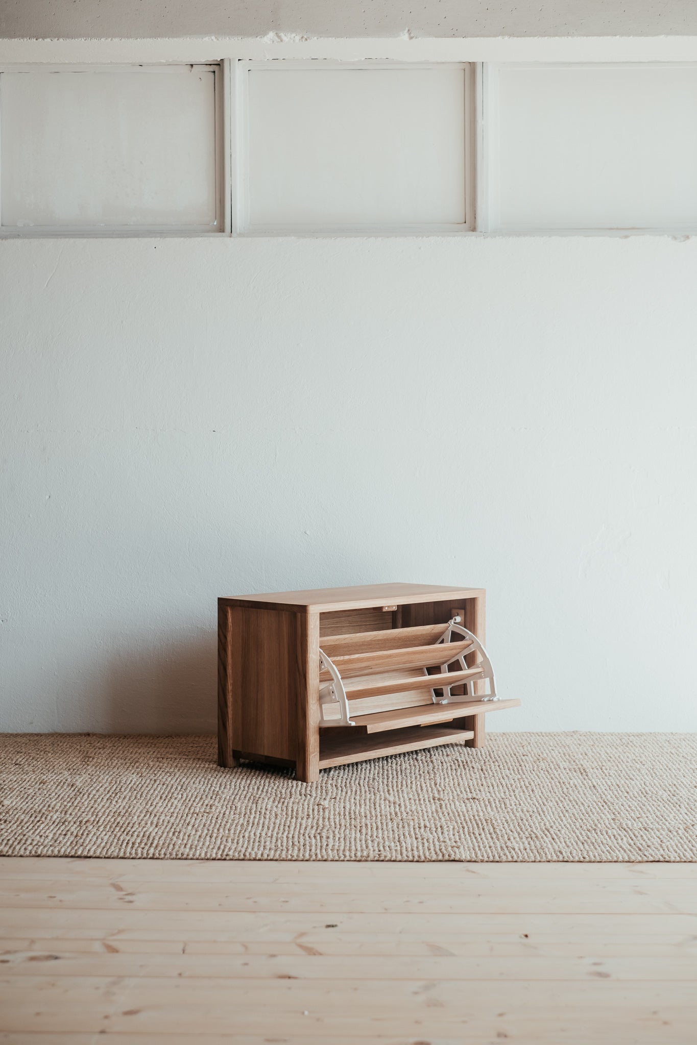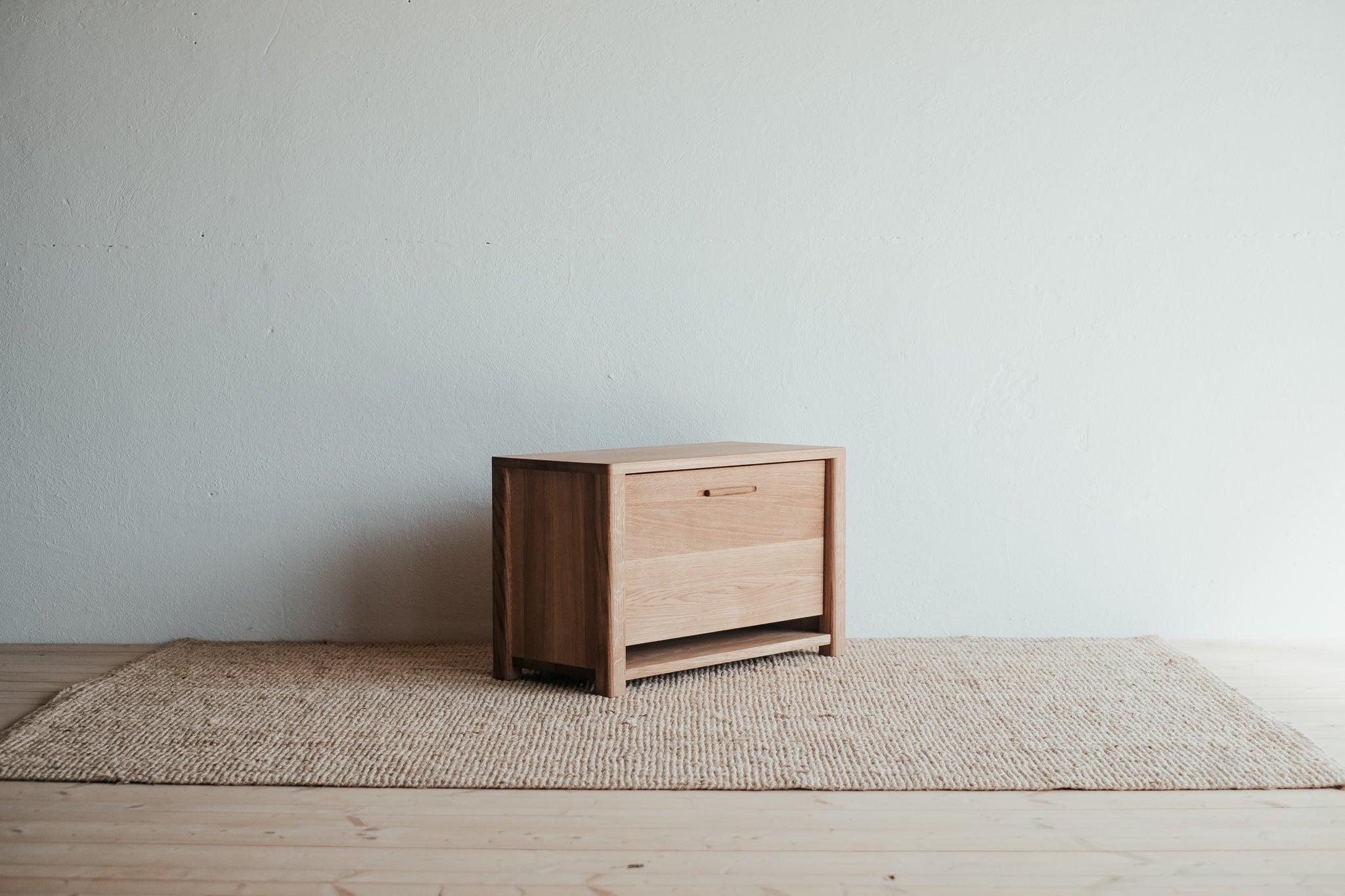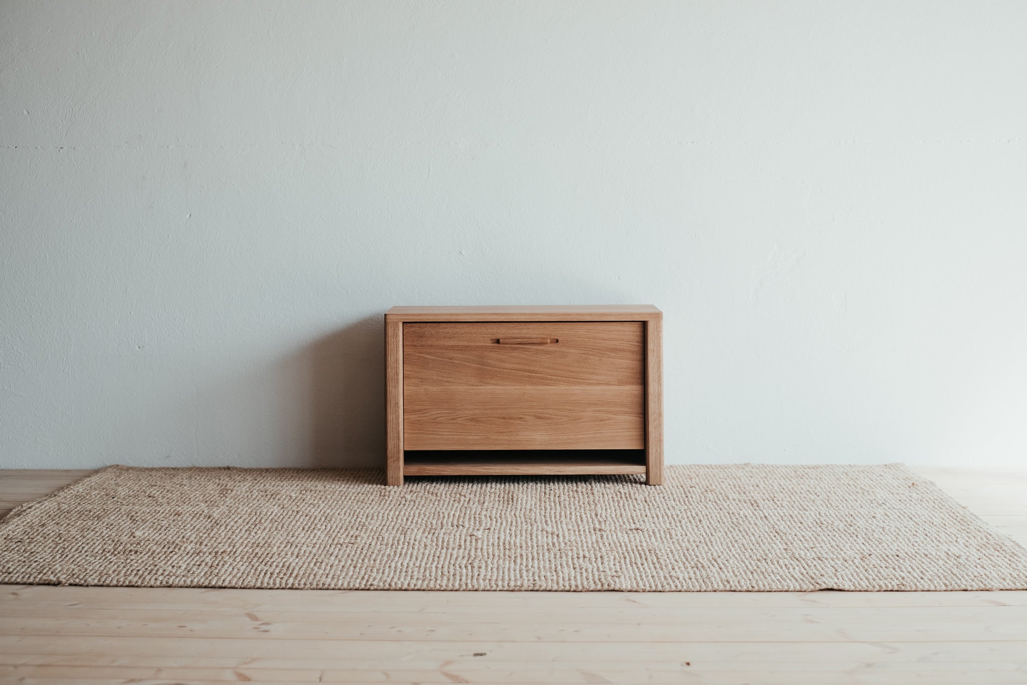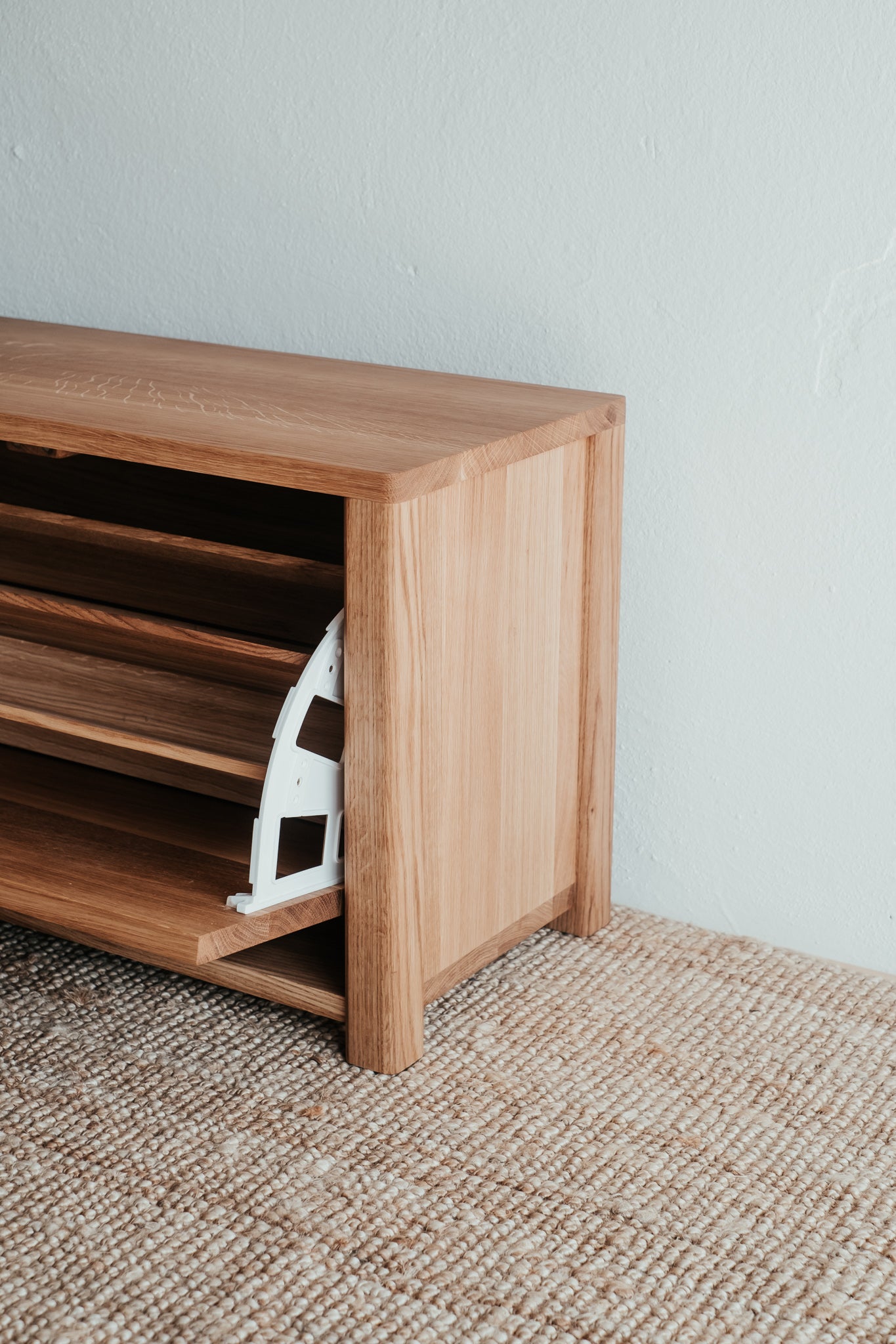 Masivní botník s čistými, elegantními liniemi. Dubové dřevo nejvyšší kvality mu dodává nezaměnitelný charakter. Velká vyklápěcí dvířka s minimalistickým dubovým držákem ukrývají velký odkládací prostor.