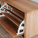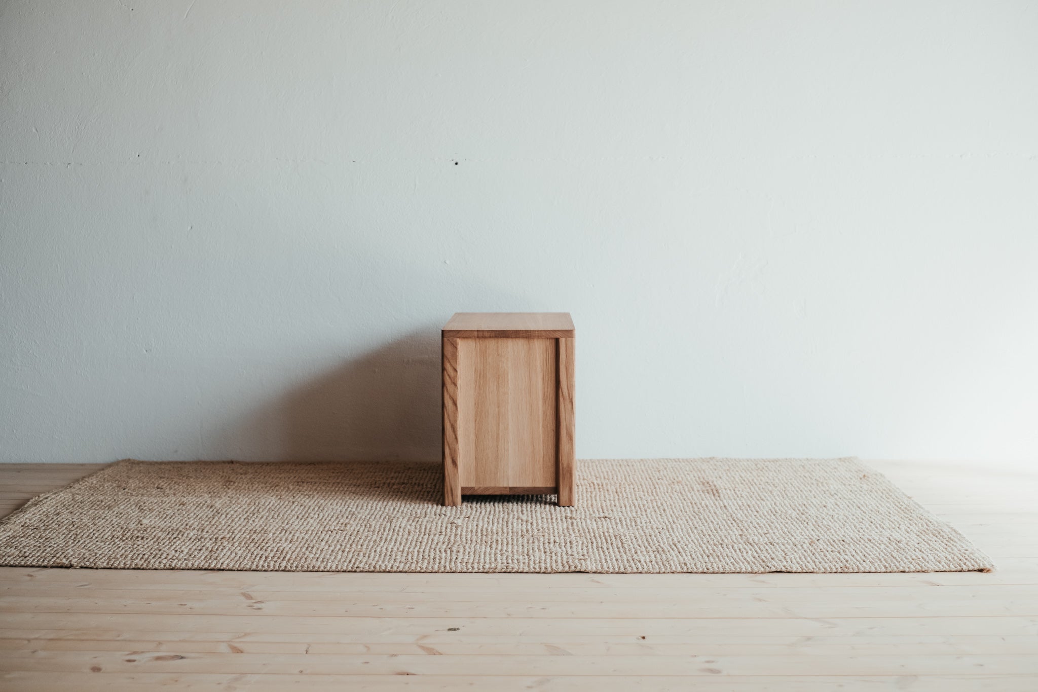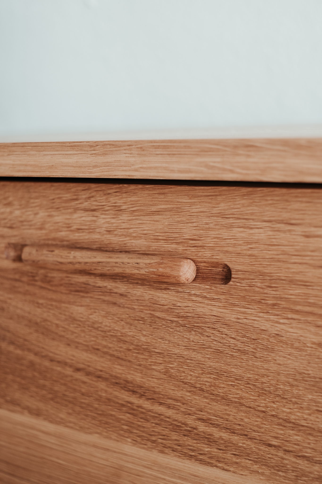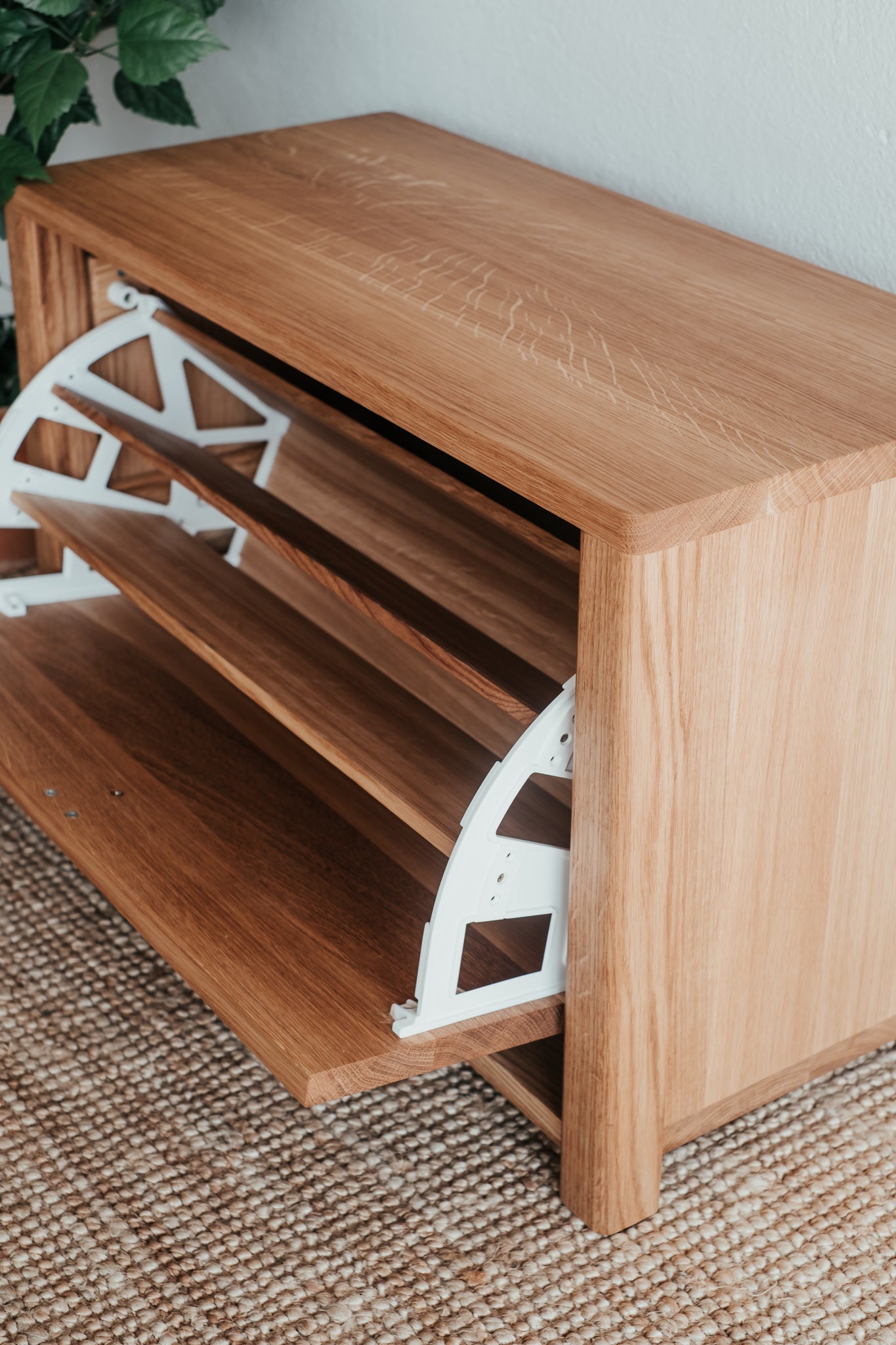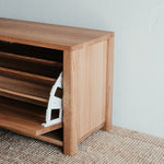 Masivní botník s čistými, elegantními liniemi. Dubové dřevo nejvyšší kvality mu dodává nezaměnitelný charakter. Velká vyklápěcí dvířka s minimalistickým dubovým držákem ukrývají velký odkládací prostor.