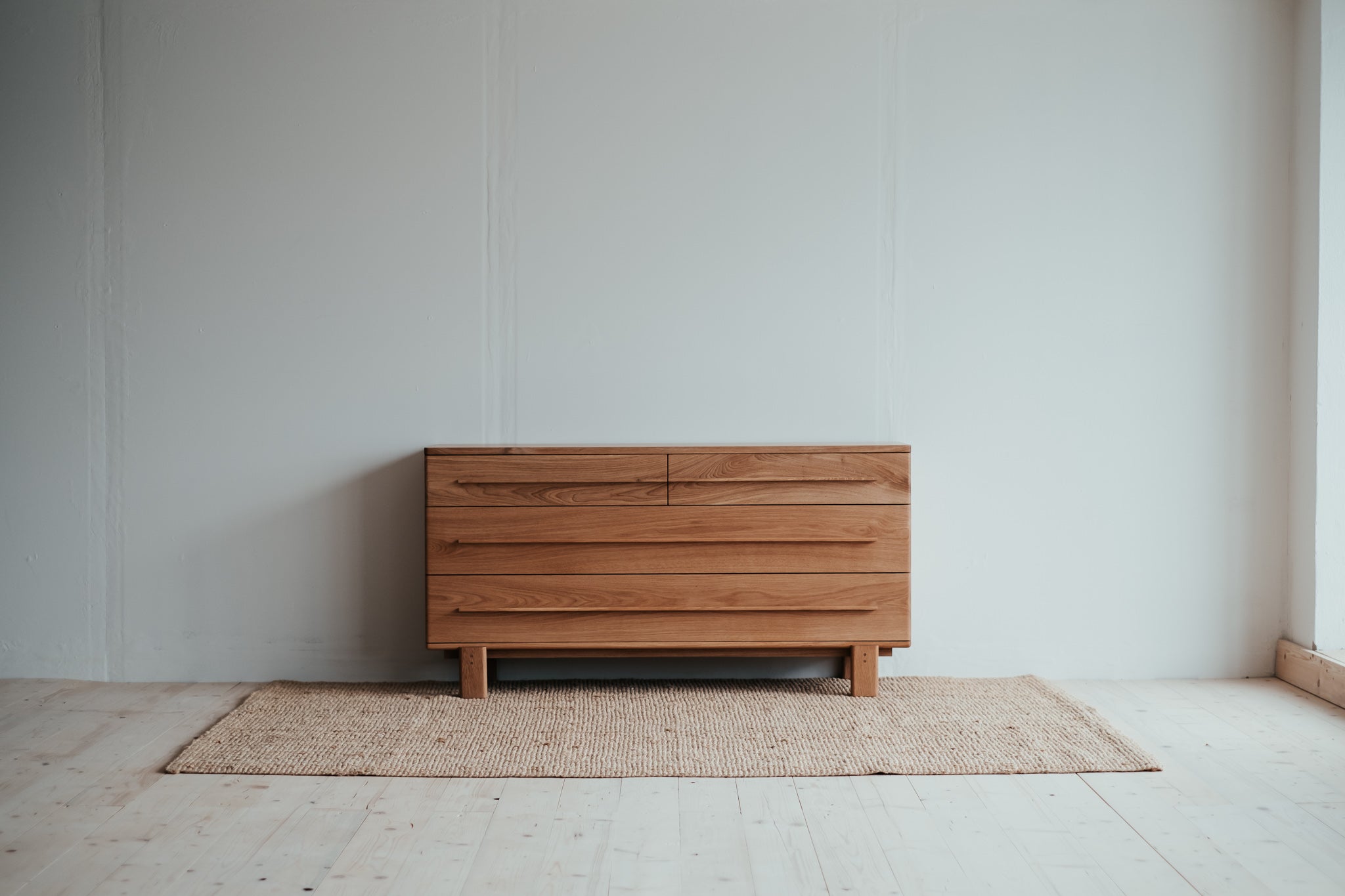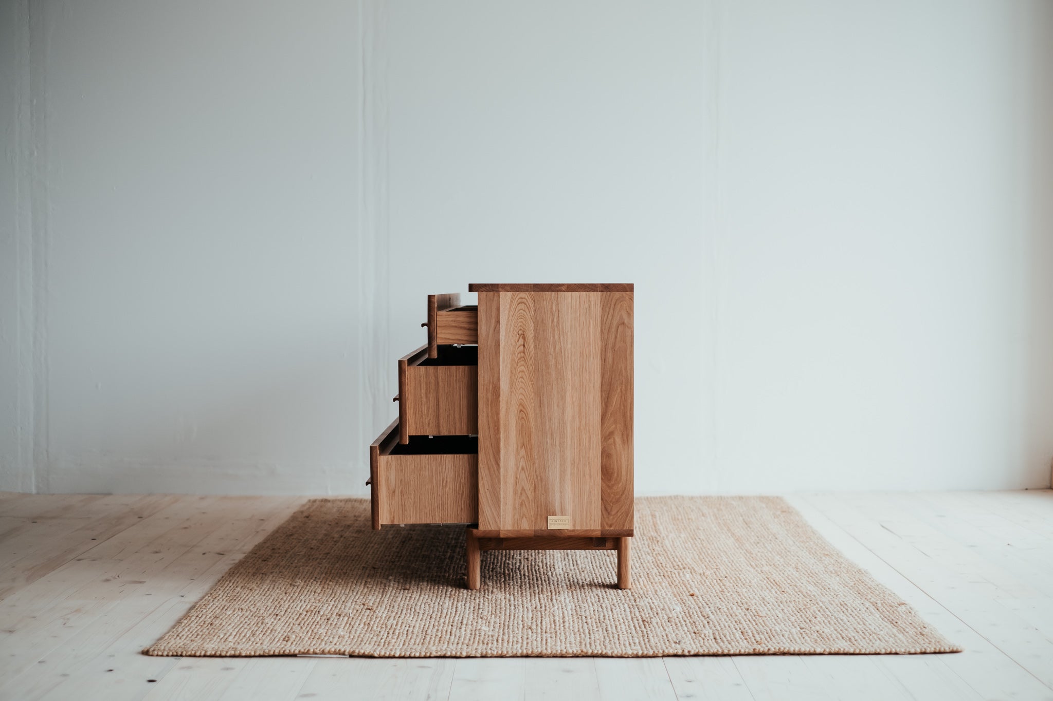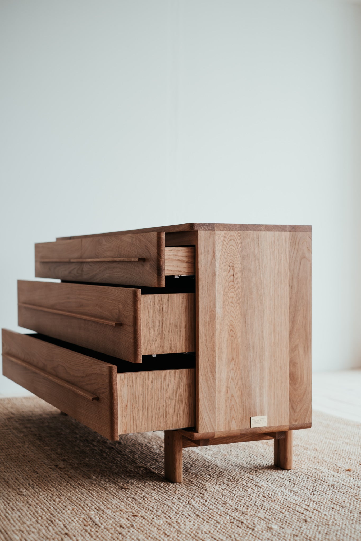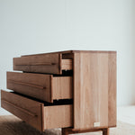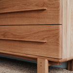 Estetické a čisté linie dubové komody z masivního dřeva, které je použito pro každý kousek tohoto unikátního nábytku. Krásně viditelná struktura dřeva uklidňuje. Úložný prostor poskytuje čtveřice elegantních zásuvek s pomalým dojezdem.