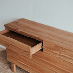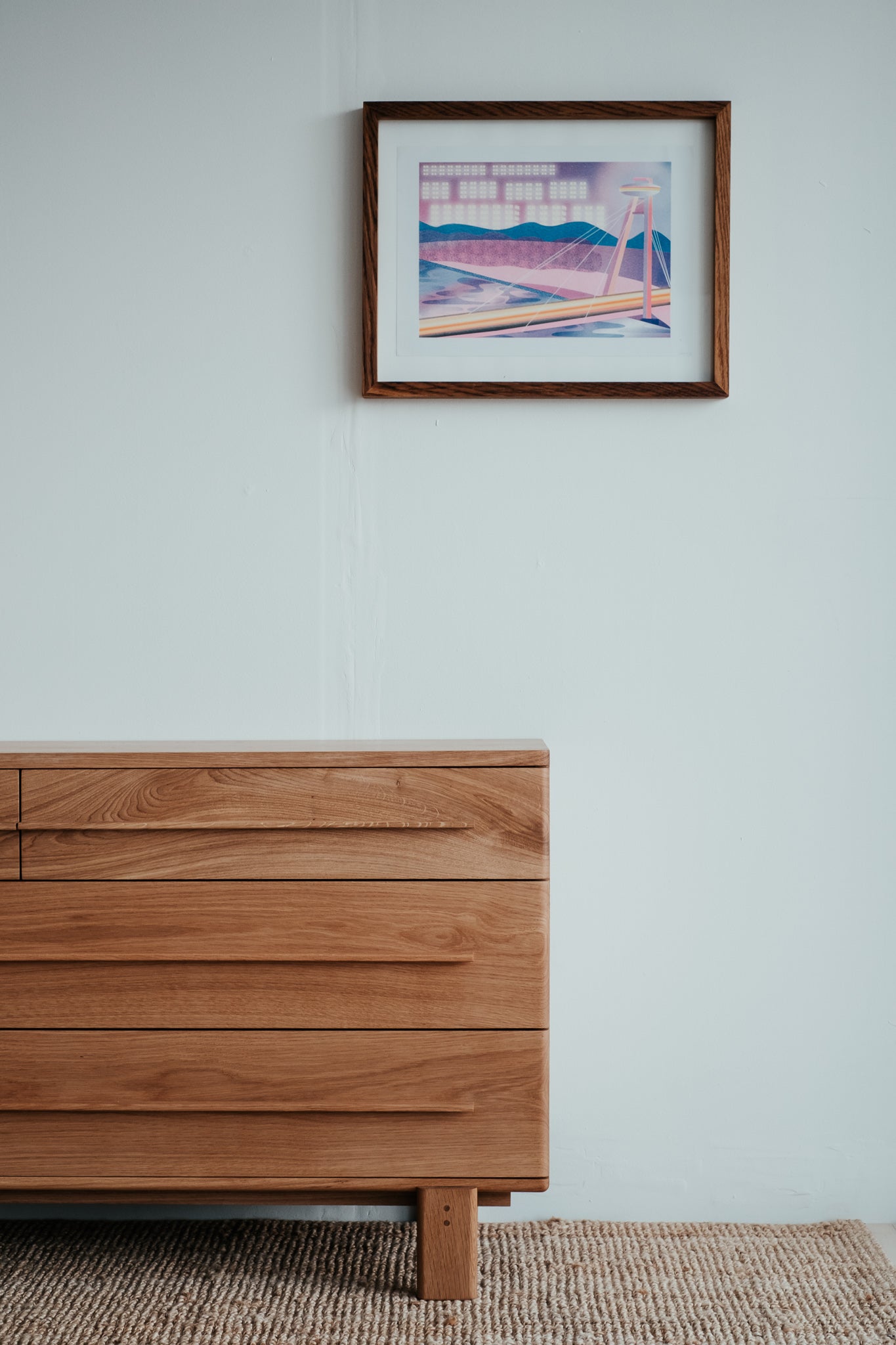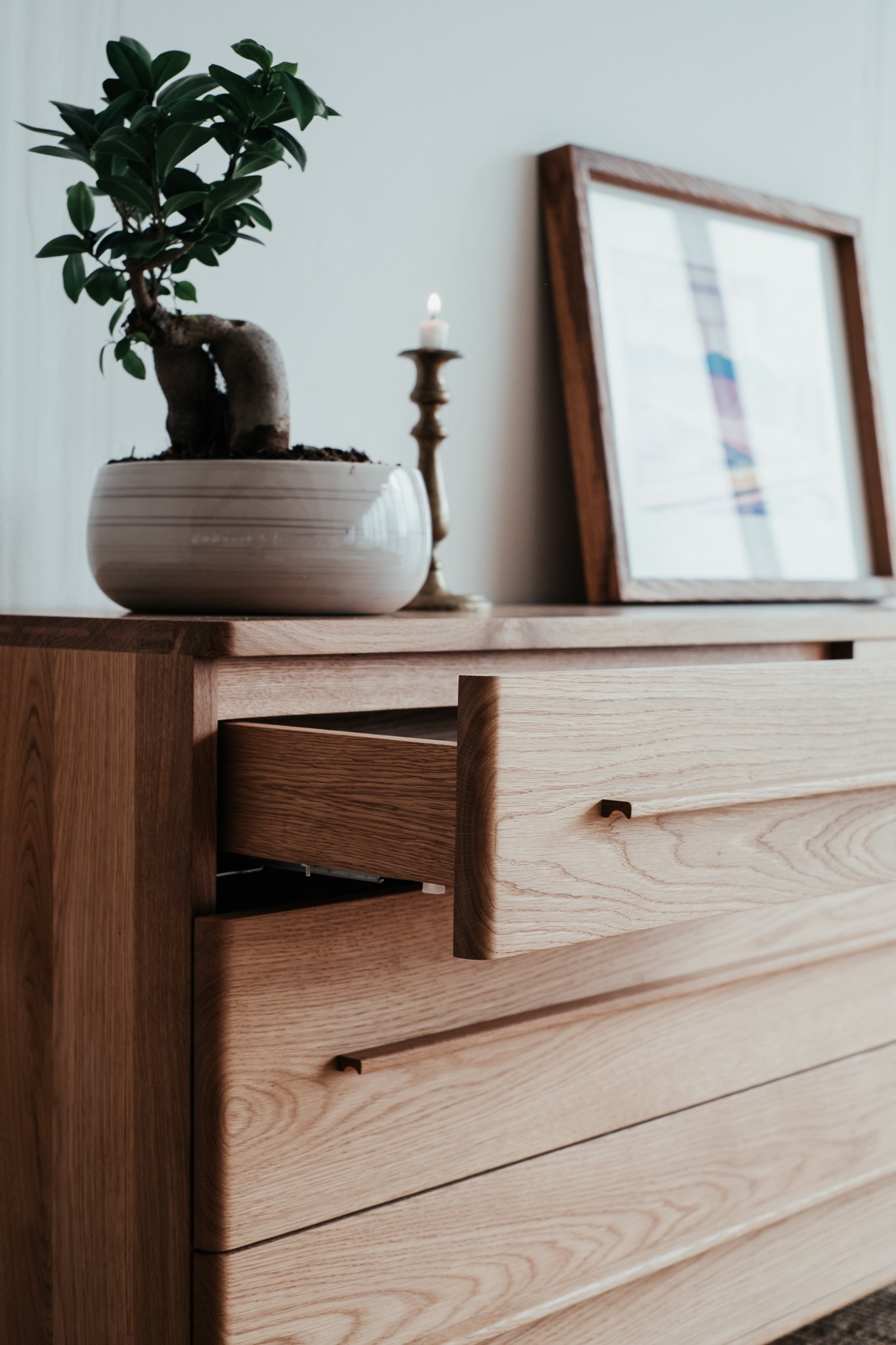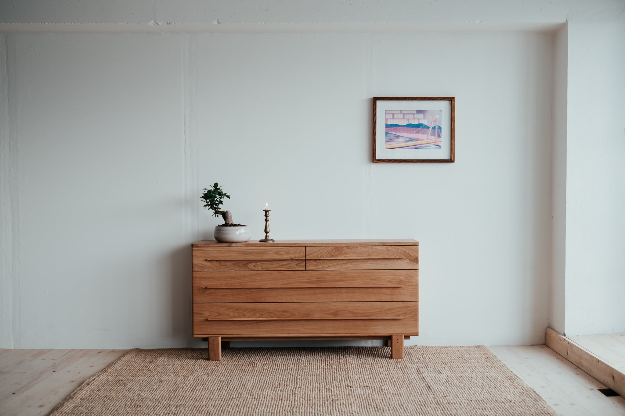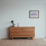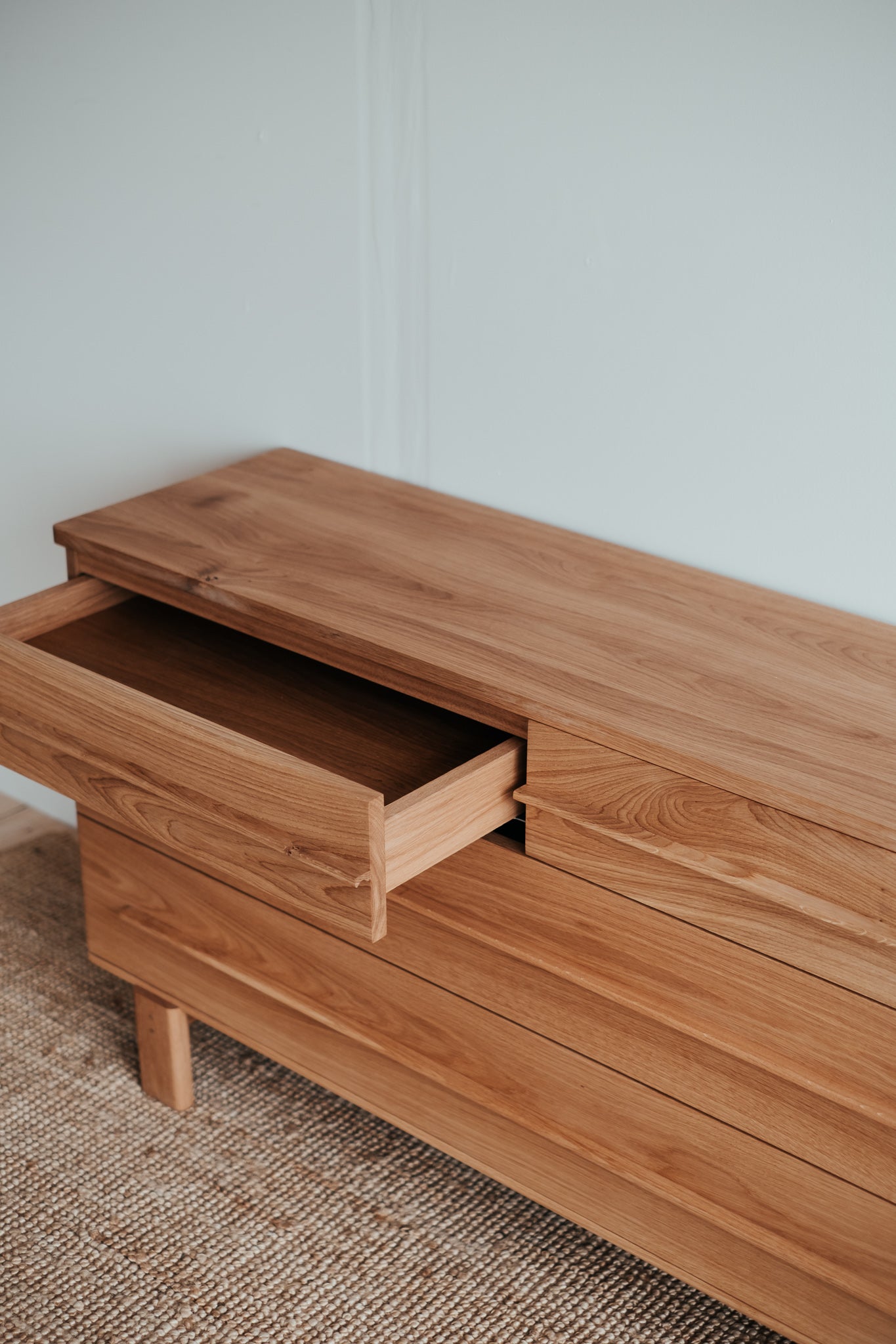 Estetické a čisté linie dubové komody z masivního dřeva, které je použito pro každý kousek tohoto unikátního nábytku. Krásně viditelná struktura dřeva uklidňuje. Úložný prostor poskytuje čtveřice elegantních zásuvek s pomalým dojezdem.