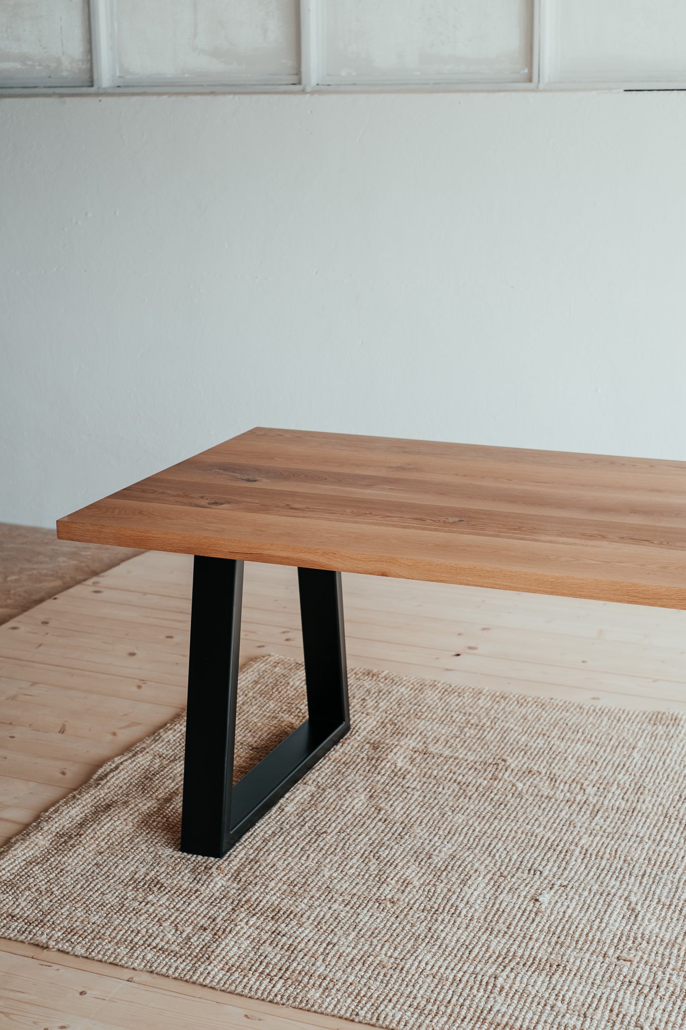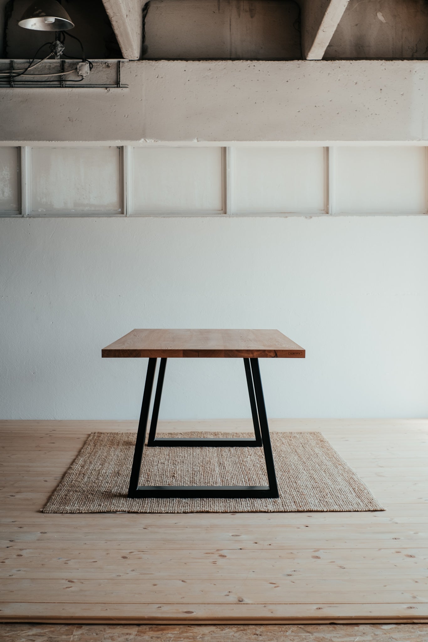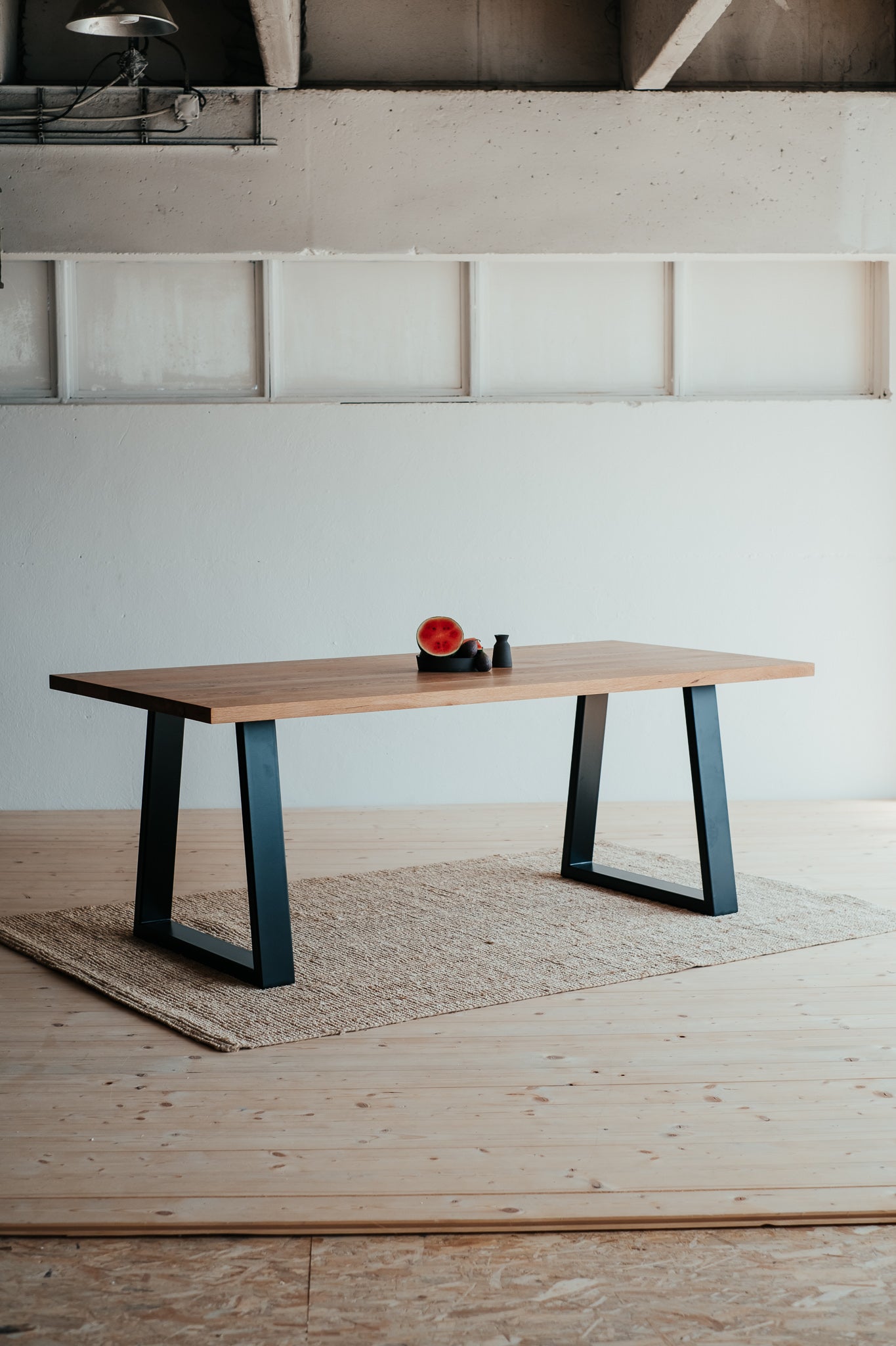 Masivní a mohutný jako dub, ze kterého pochází a přitom stále vzdušný a nevšední díky unikátnímu designu lichoběžníkových nohou. Spojuje v sobě užitečnost s estetikou, sílu s jemností a teplo dřeva s chladem kovu.