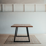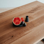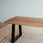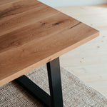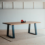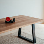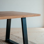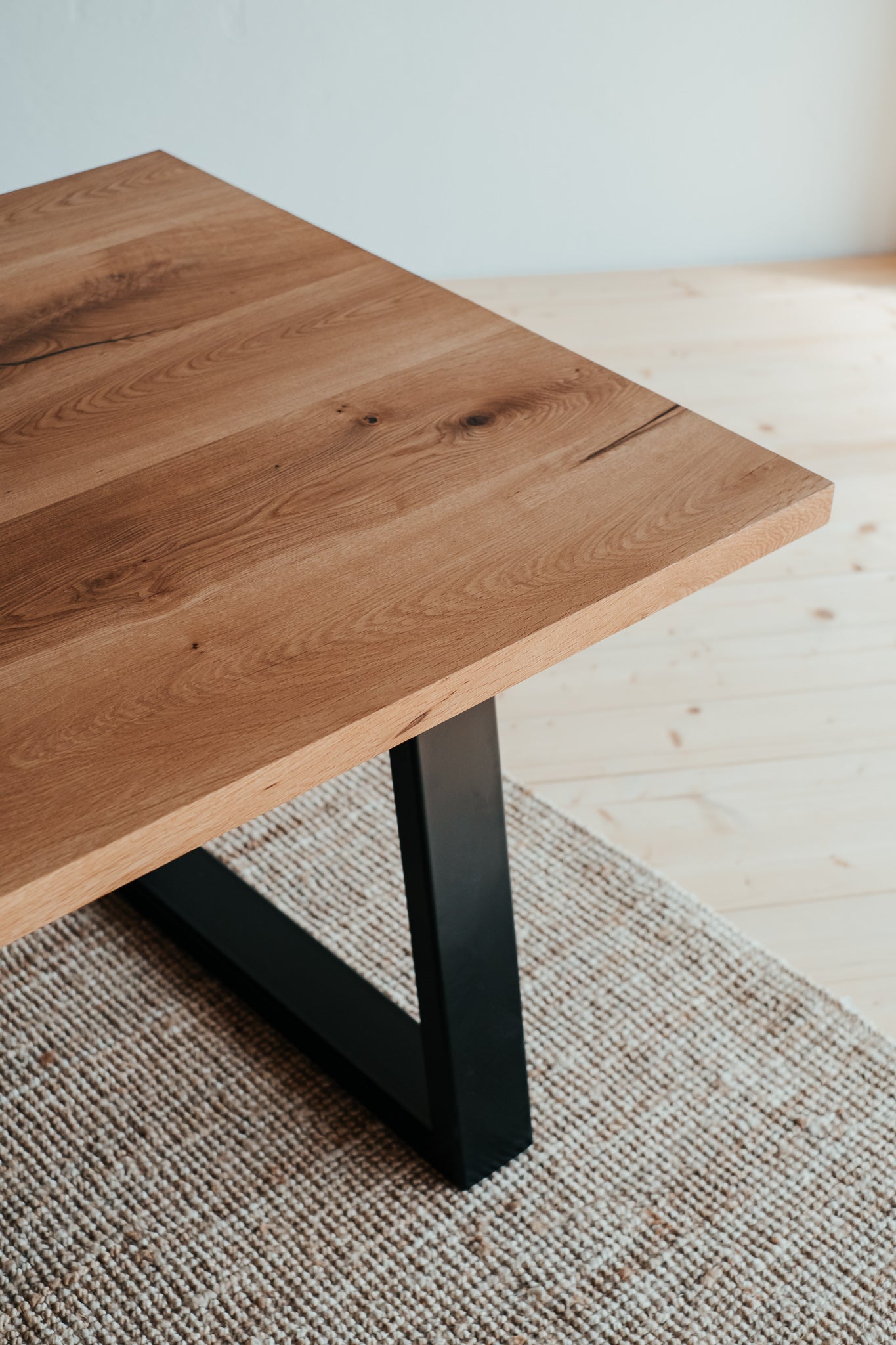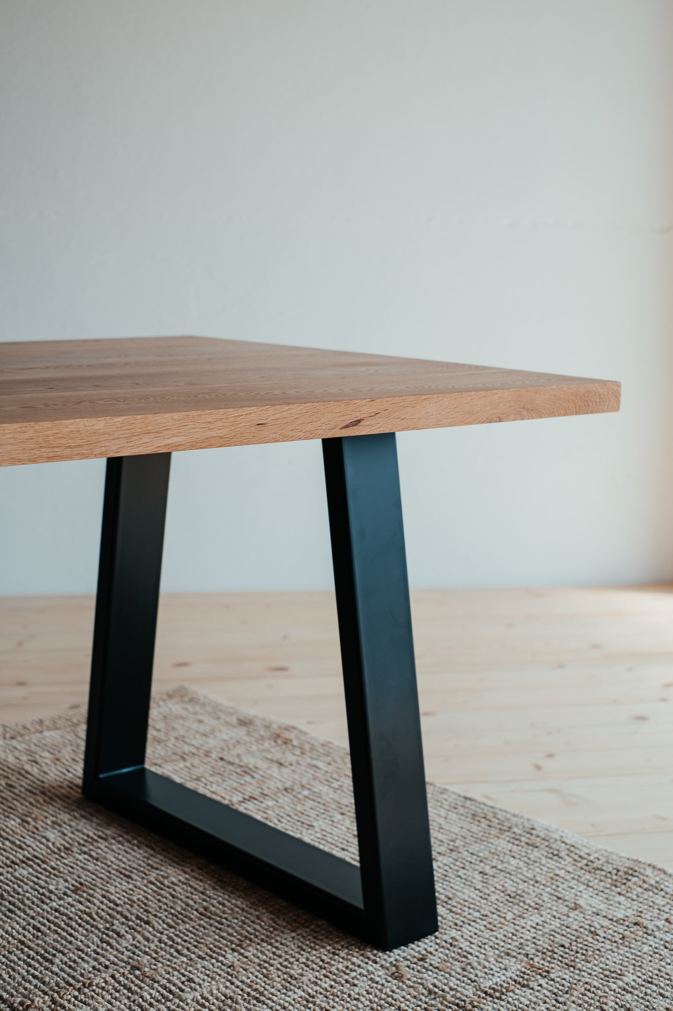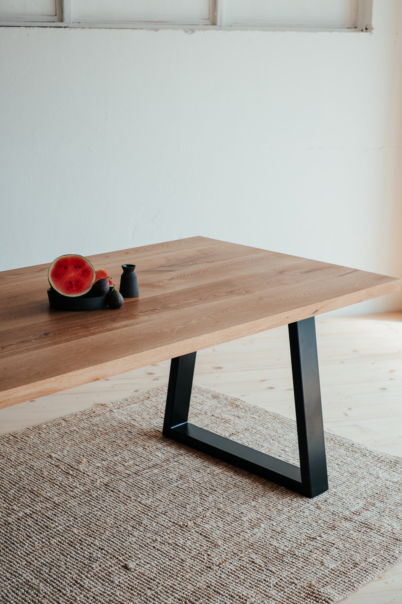 Masivní a mohutný jako dub, ze kterého pochází a přitom stále vzdušný a nevšední díky unikátnímu designu lichoběžníkových nohou. Spojuje v sobě užitečnost s estetikou, sílu s jemností a teplo dřeva s chladem kovu.