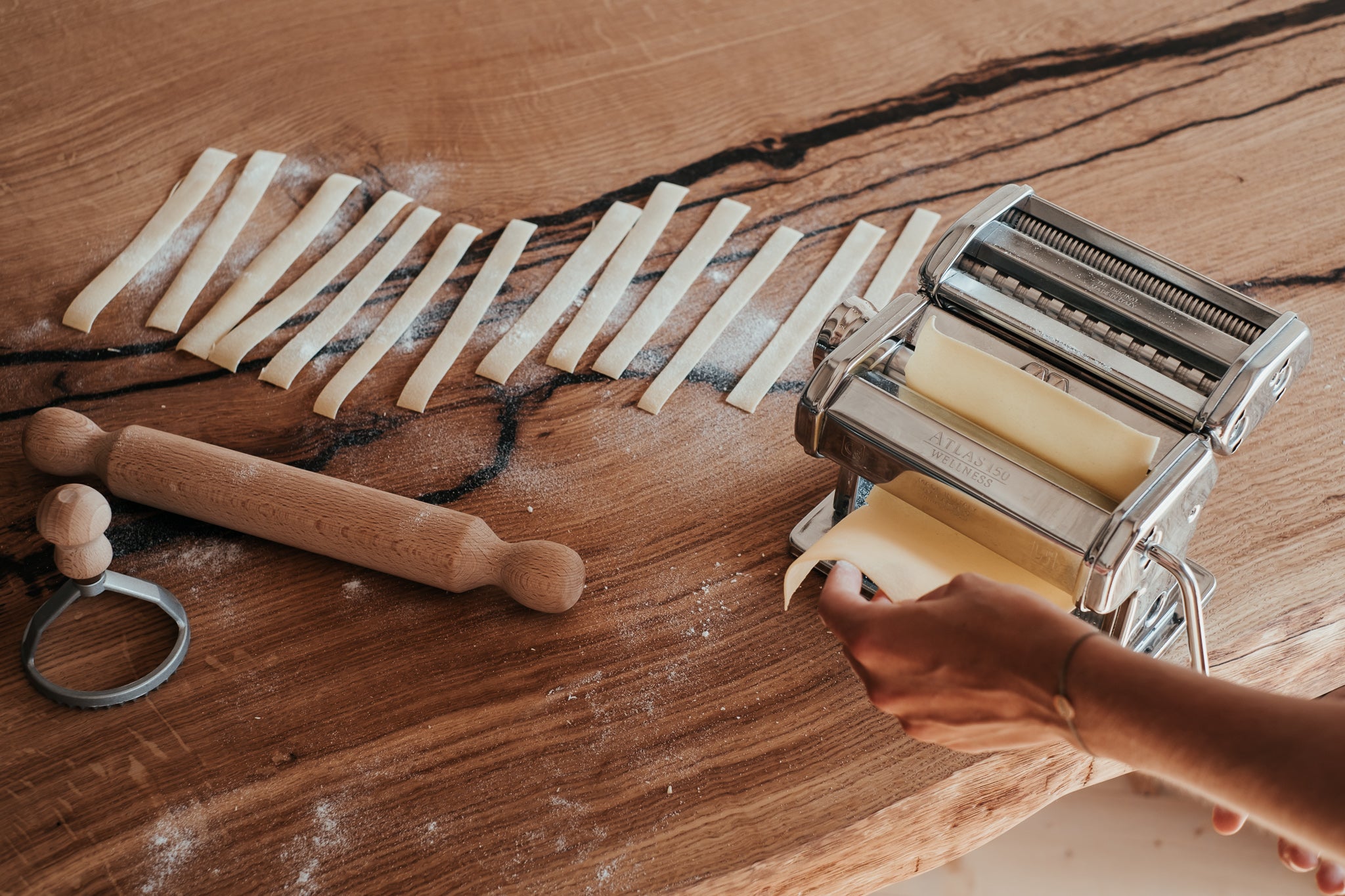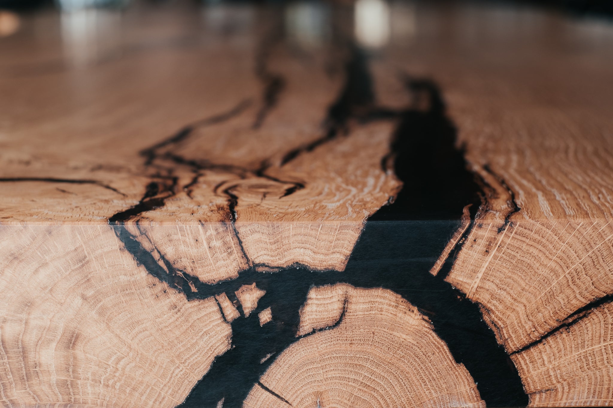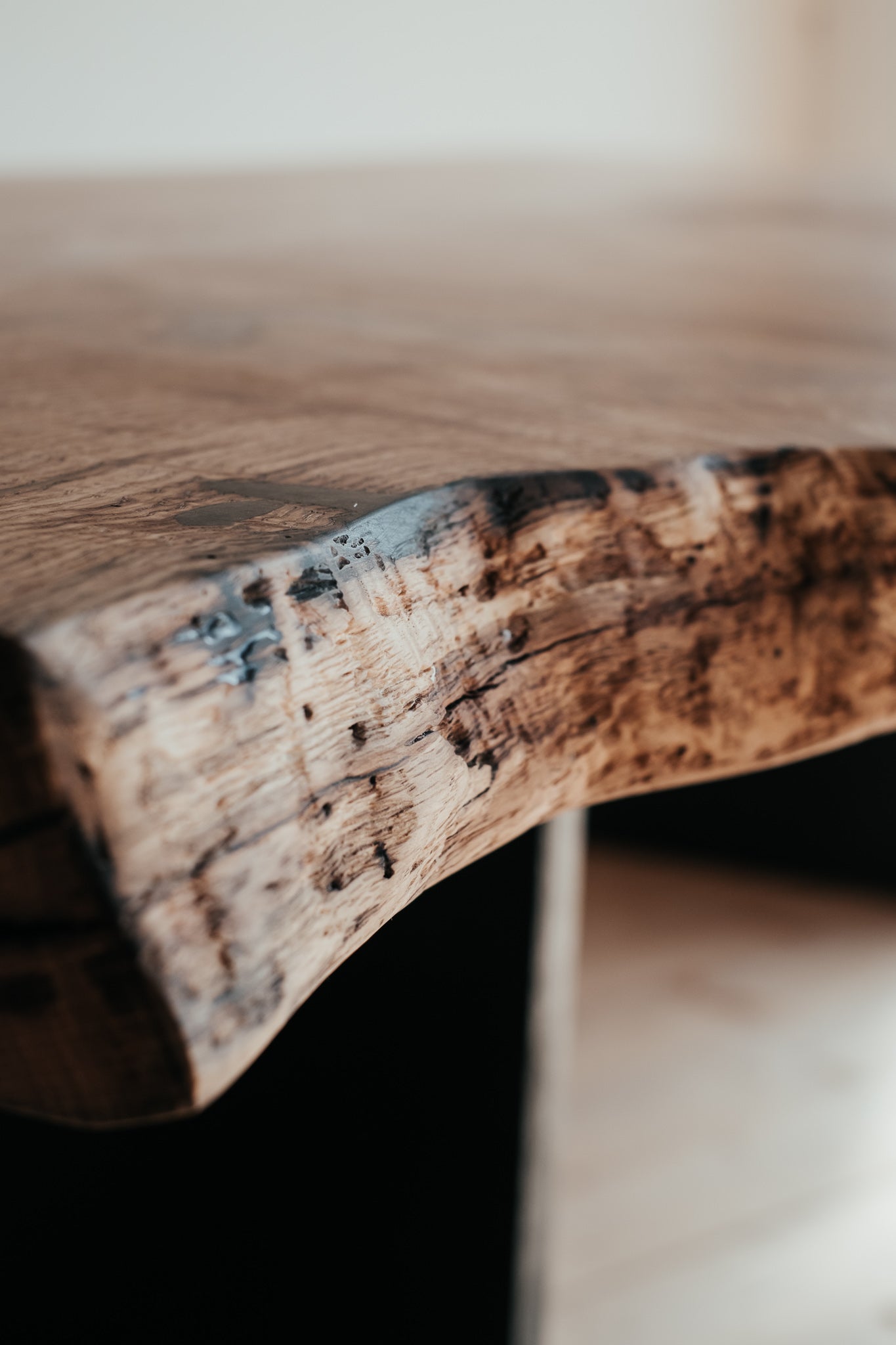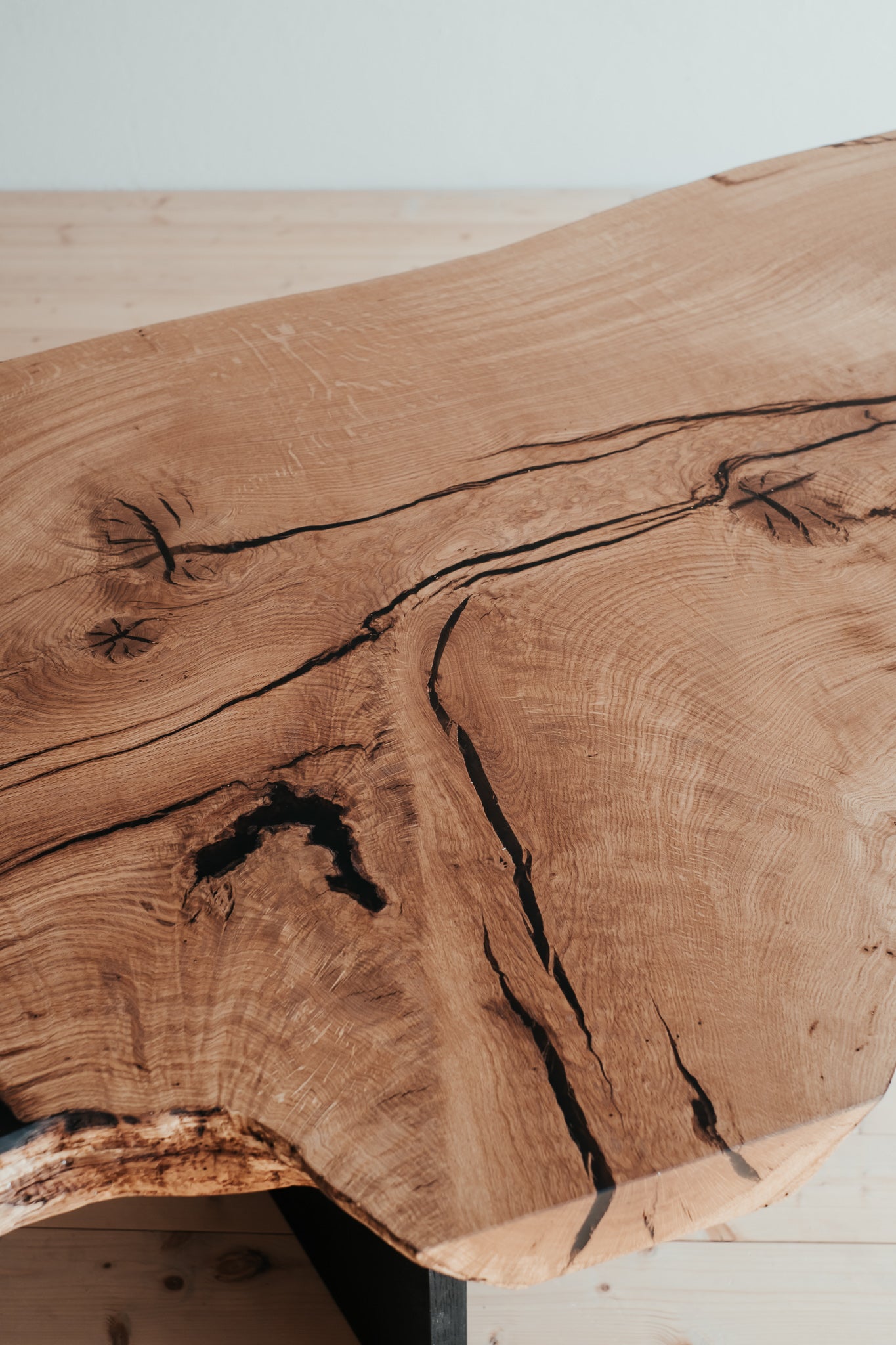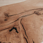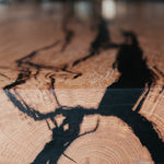 Základem tohoto stolu je masivní dubové dřevo nejvyšší kvality. Praskliny jsme pečlivě ošetřili pryskyřicí a mechanickými prvky. Abychom zabezpečili maximální kvalitu a životnost, dbali jsme na každý detail, jako je pečlivý výběr dřeva, jeho vlhkost i ošetření. Díky tomu jsme z krásného stromu dokázali vytvořit dokonalý stůl.