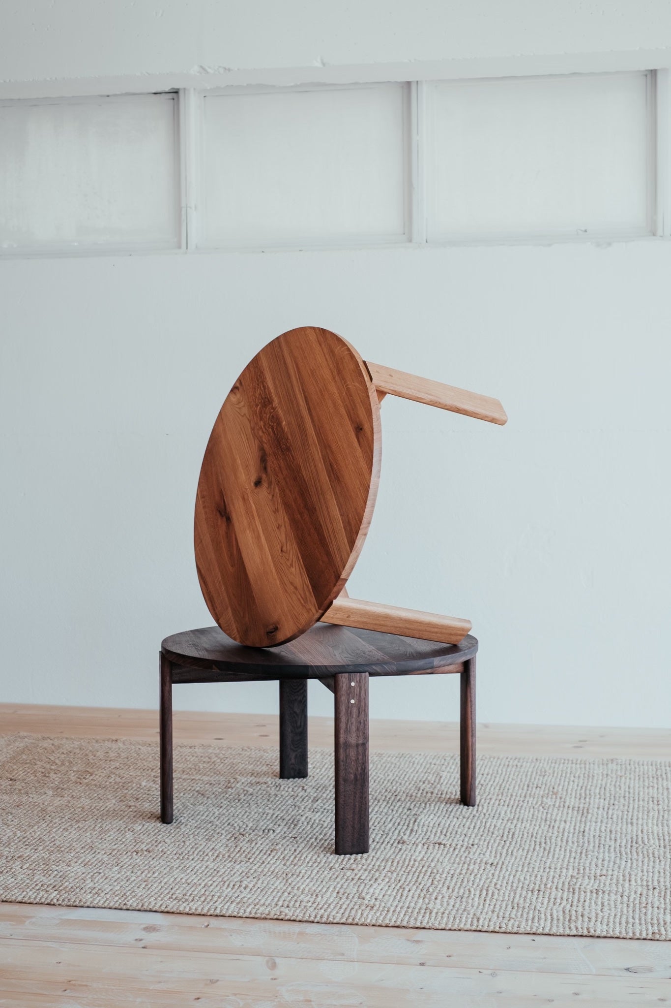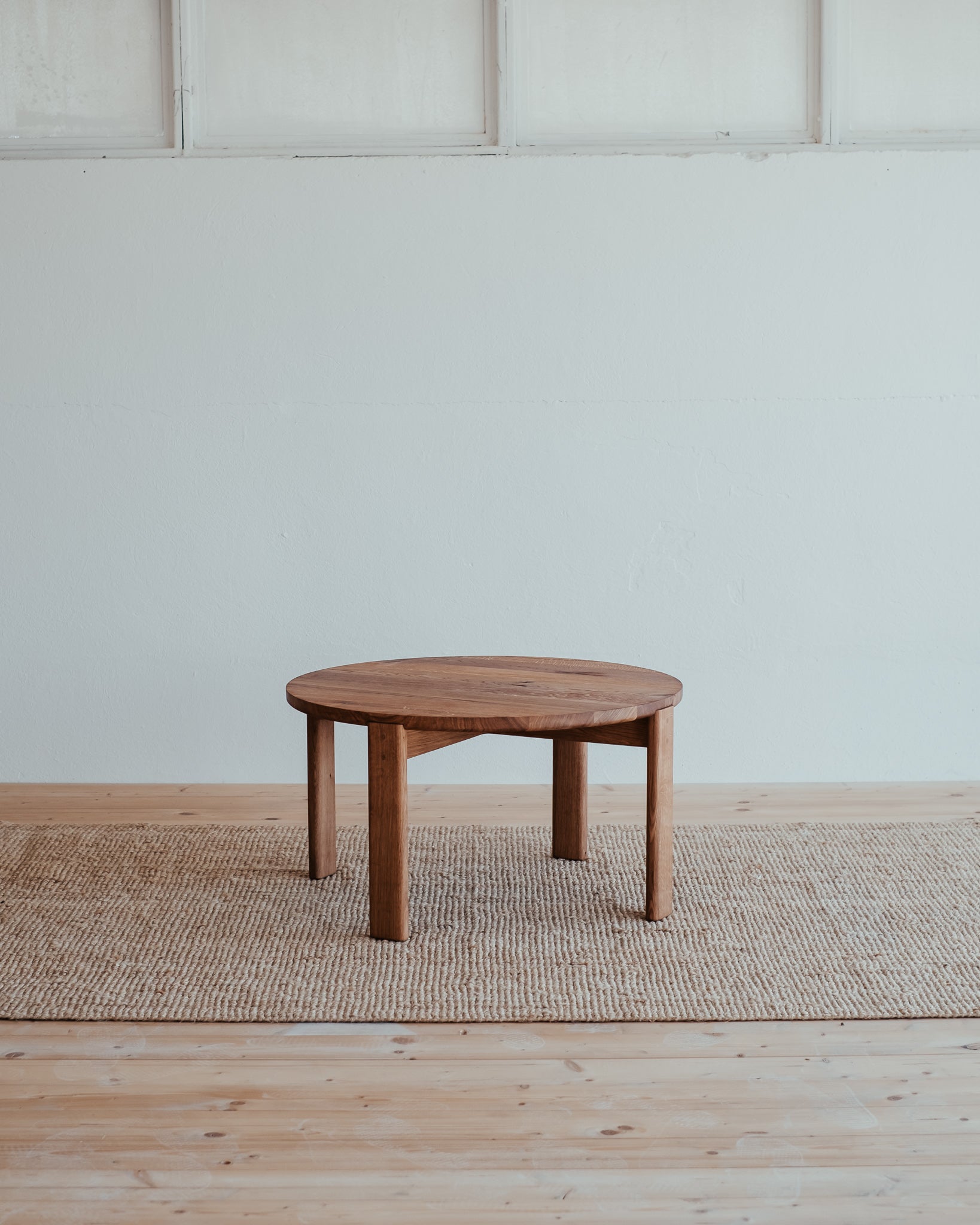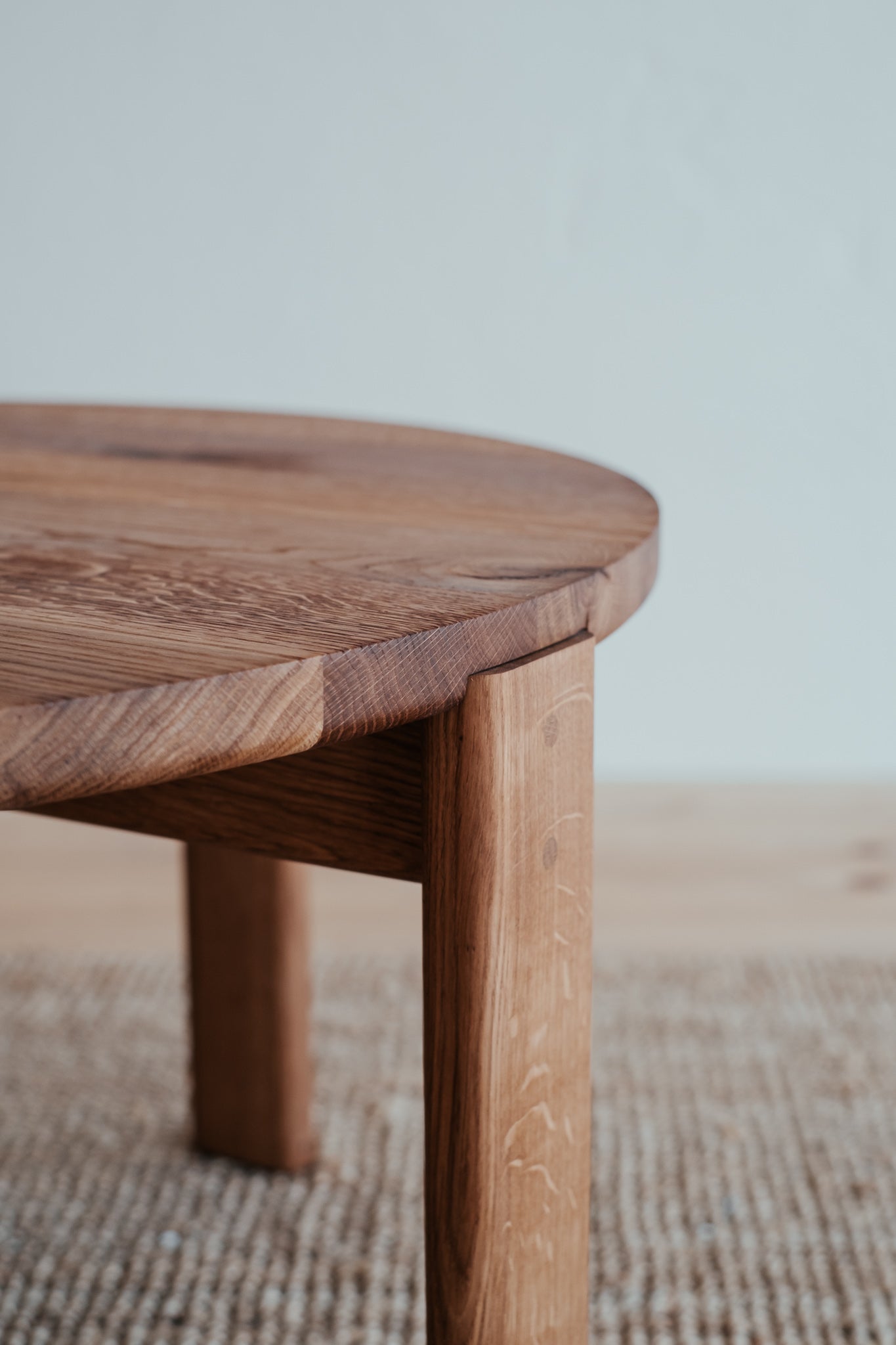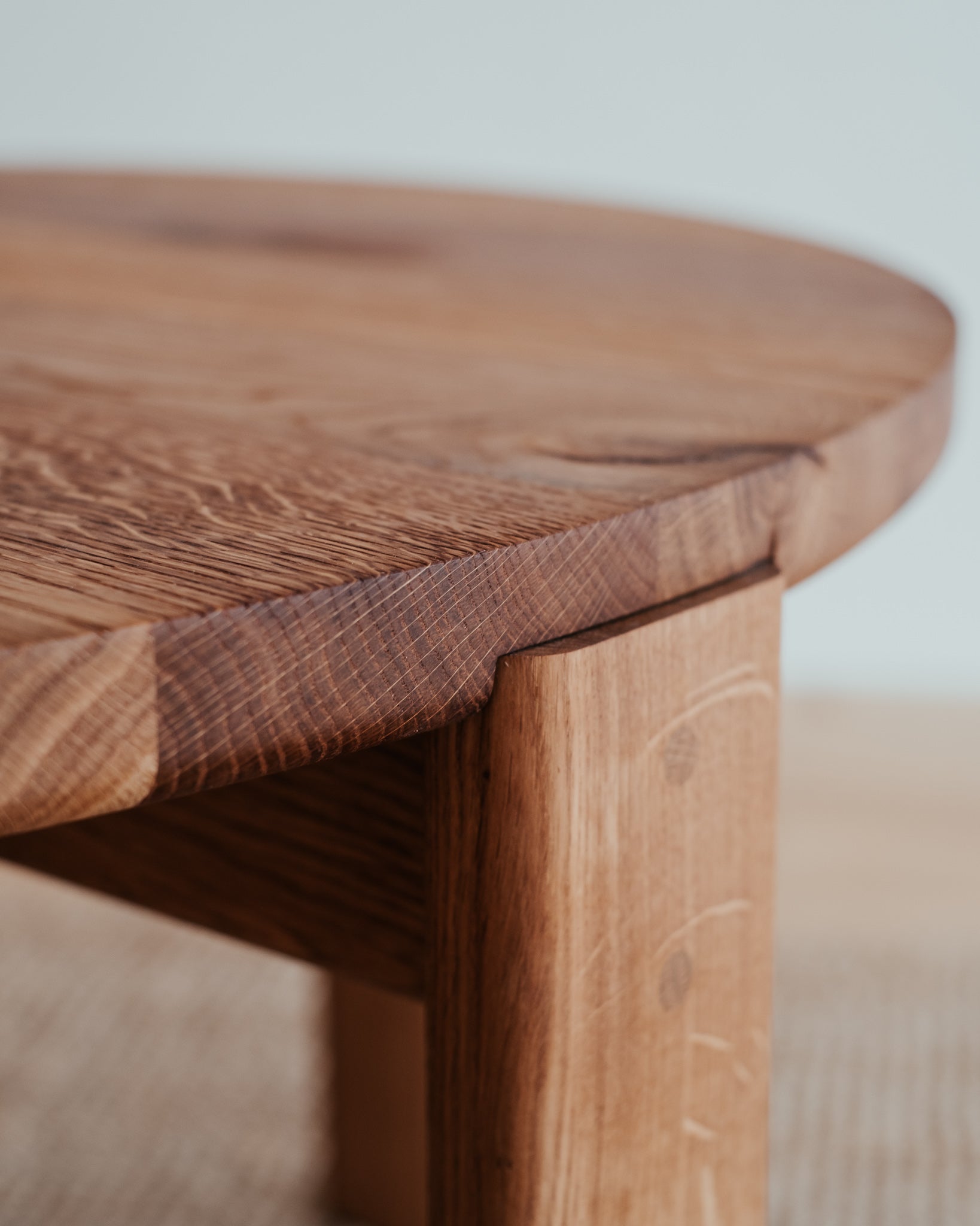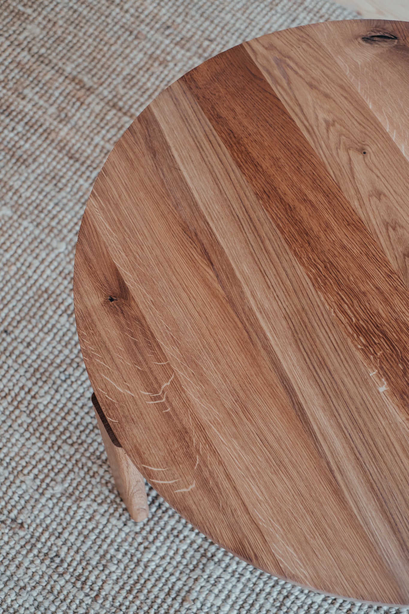 Precizní řemeslná práce, která nechává vyniknout strukturu masivního dubového dřeva a jeho přirozenou krásu. Jemně zaoblené hrany působí měkce a uklidňujícím dojmem. Krátké nohy a velká kruhová deska jsou viditelně propojeny dubovými kolíky, čímž přidávají zajímavý detail dokreslující celkový dojem stolu.