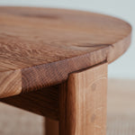 Řemeslně dokonalý kruhový stolek, který vyniká krásou dřeva, ze kterého pochází. Jemně zaoblené hrany a čistá plocha s krásnou strukturou masivního dubového dřeva s malým, vyšperkovaným detailem v podobě dubových kolíků.