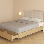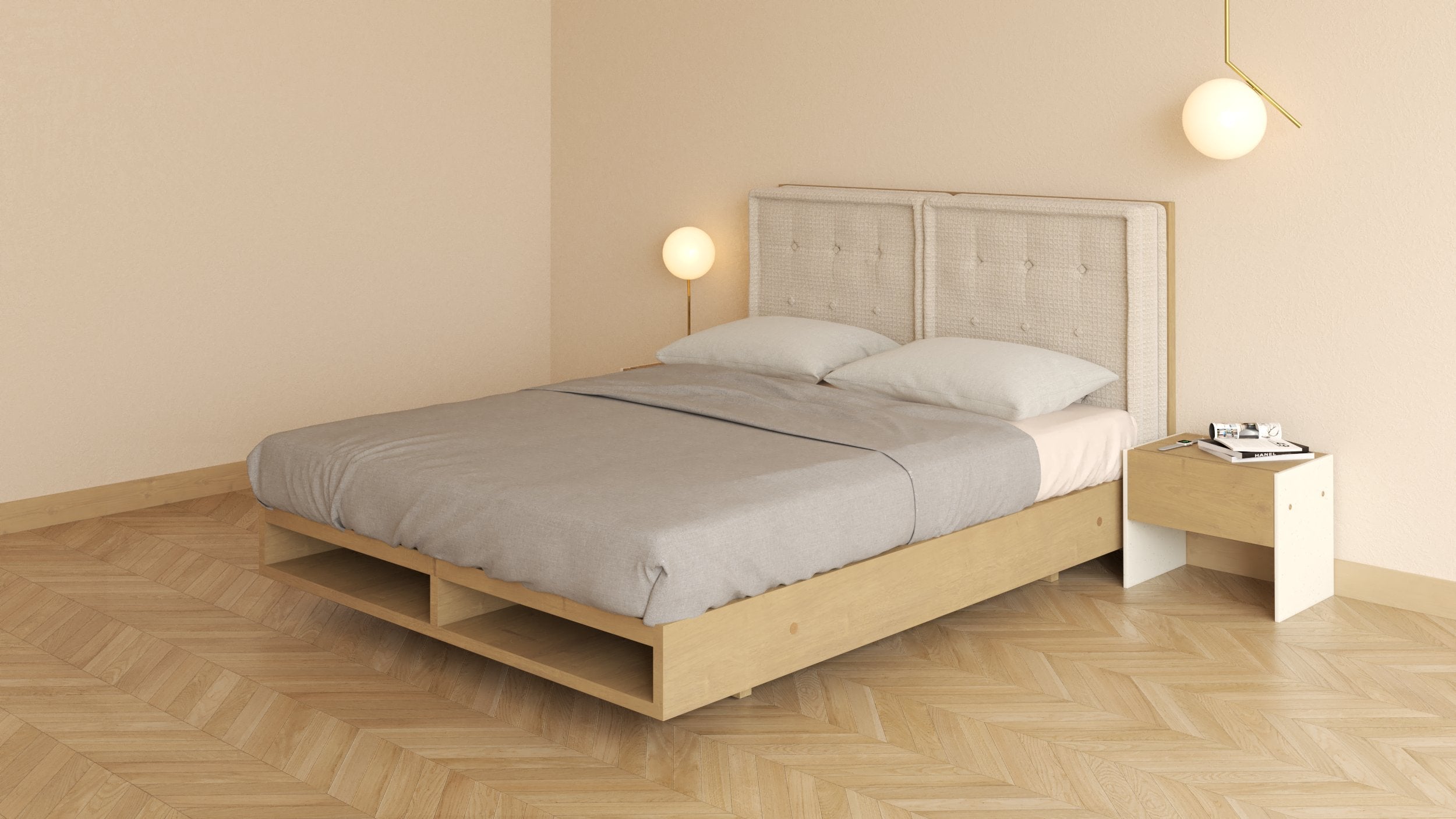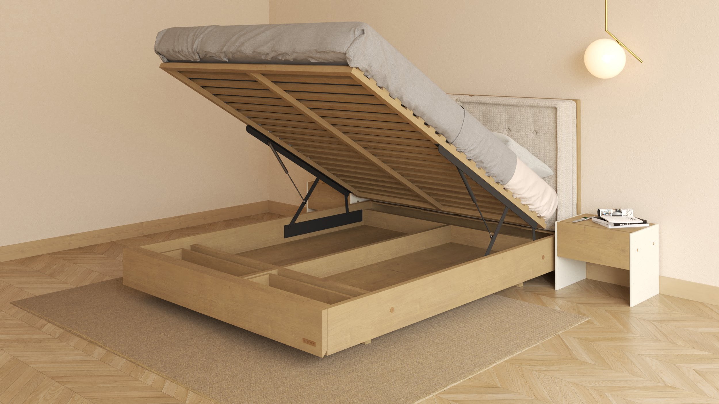 Důmyslný a řemeslně dokonale provedený design činí z této postele něco unikátního. Jasanové dřevo a minimalistické linie působí čistě a elegantně. No to není všechno. Nejen, že si umíte přizpůsobit úložný prostor, ale také samotnou výšku postele, což se s přibývajícím věkem sejde každému. Praktickým designovým prvkem je také matrace lícující s postelí a zvedací rošt.