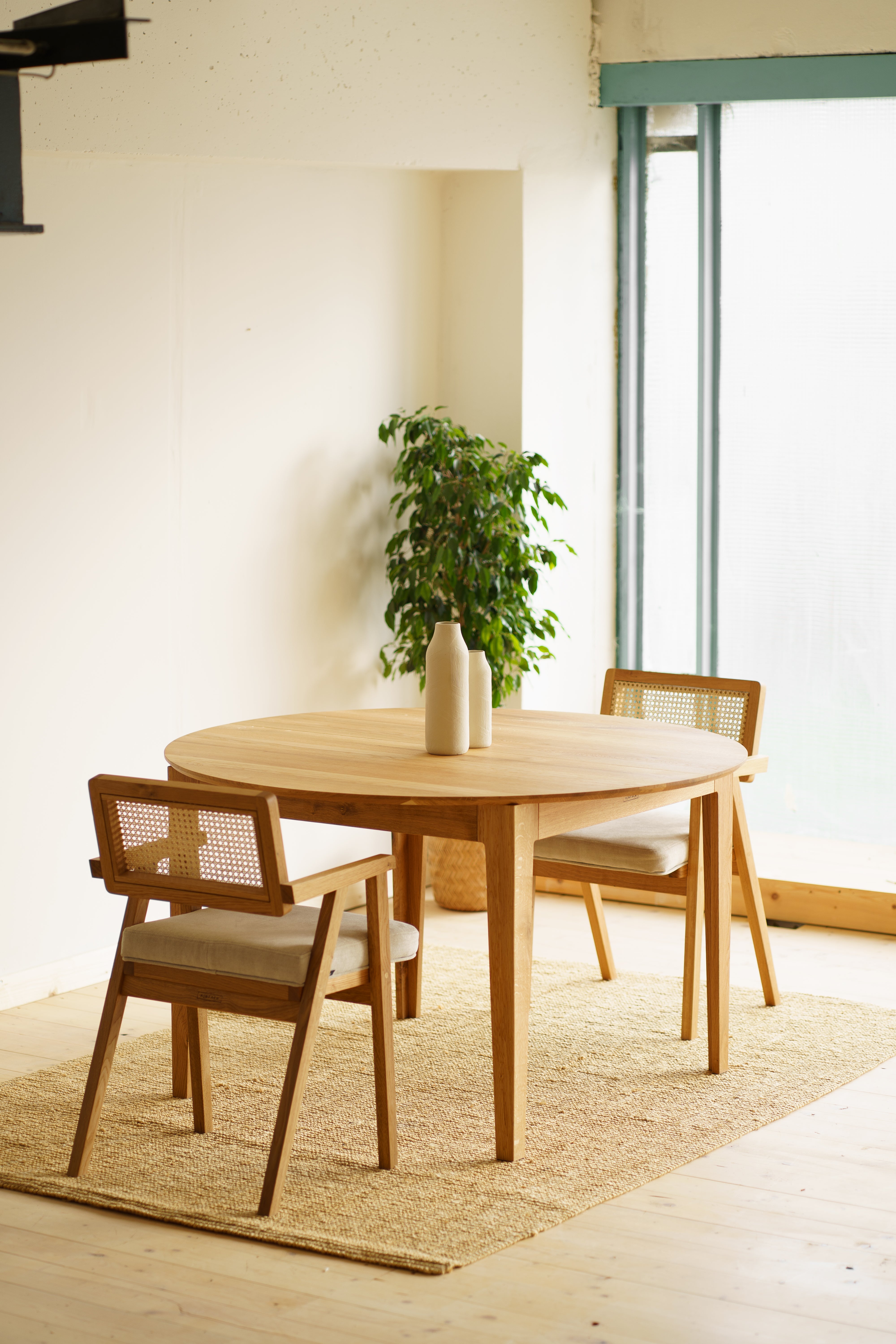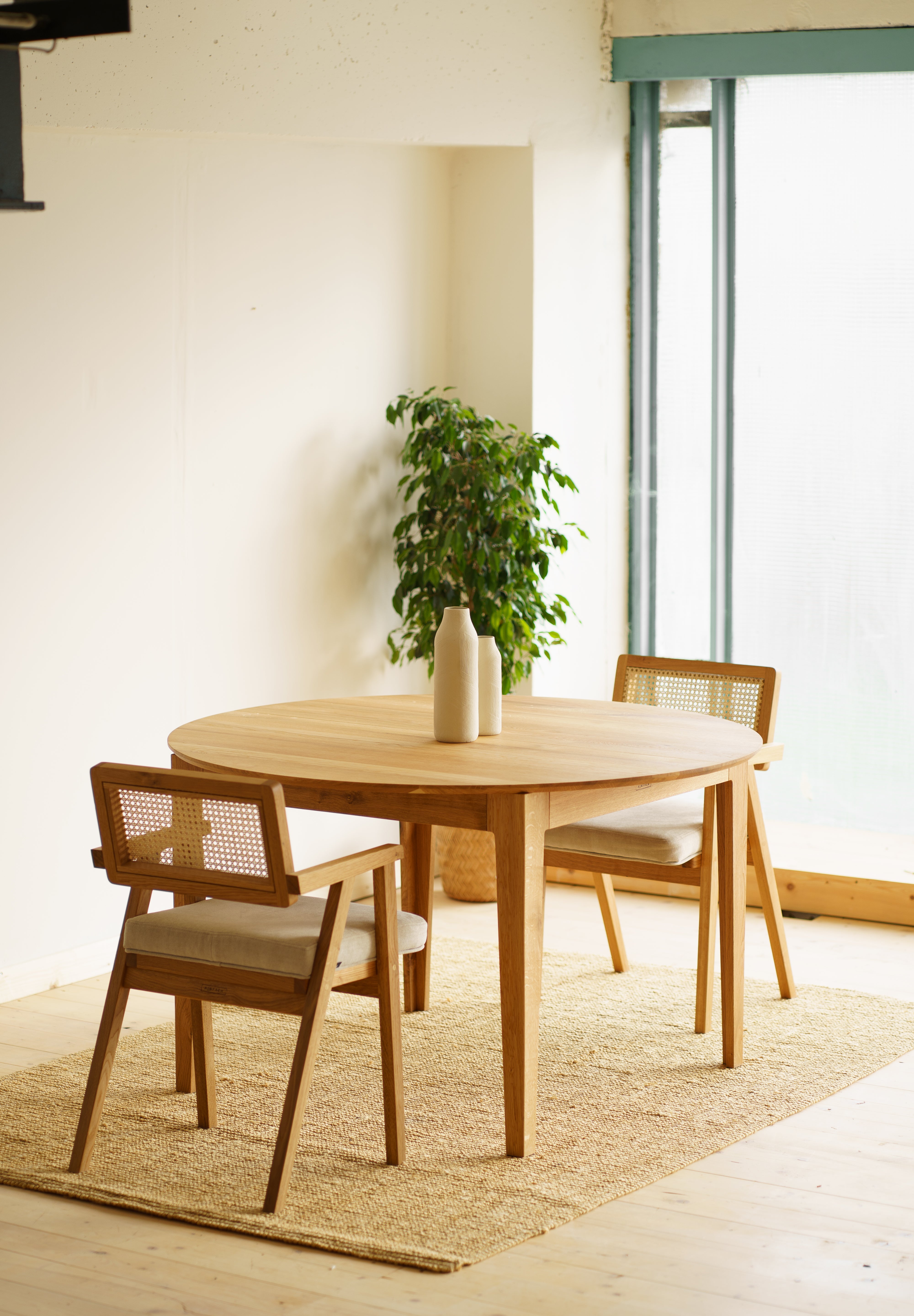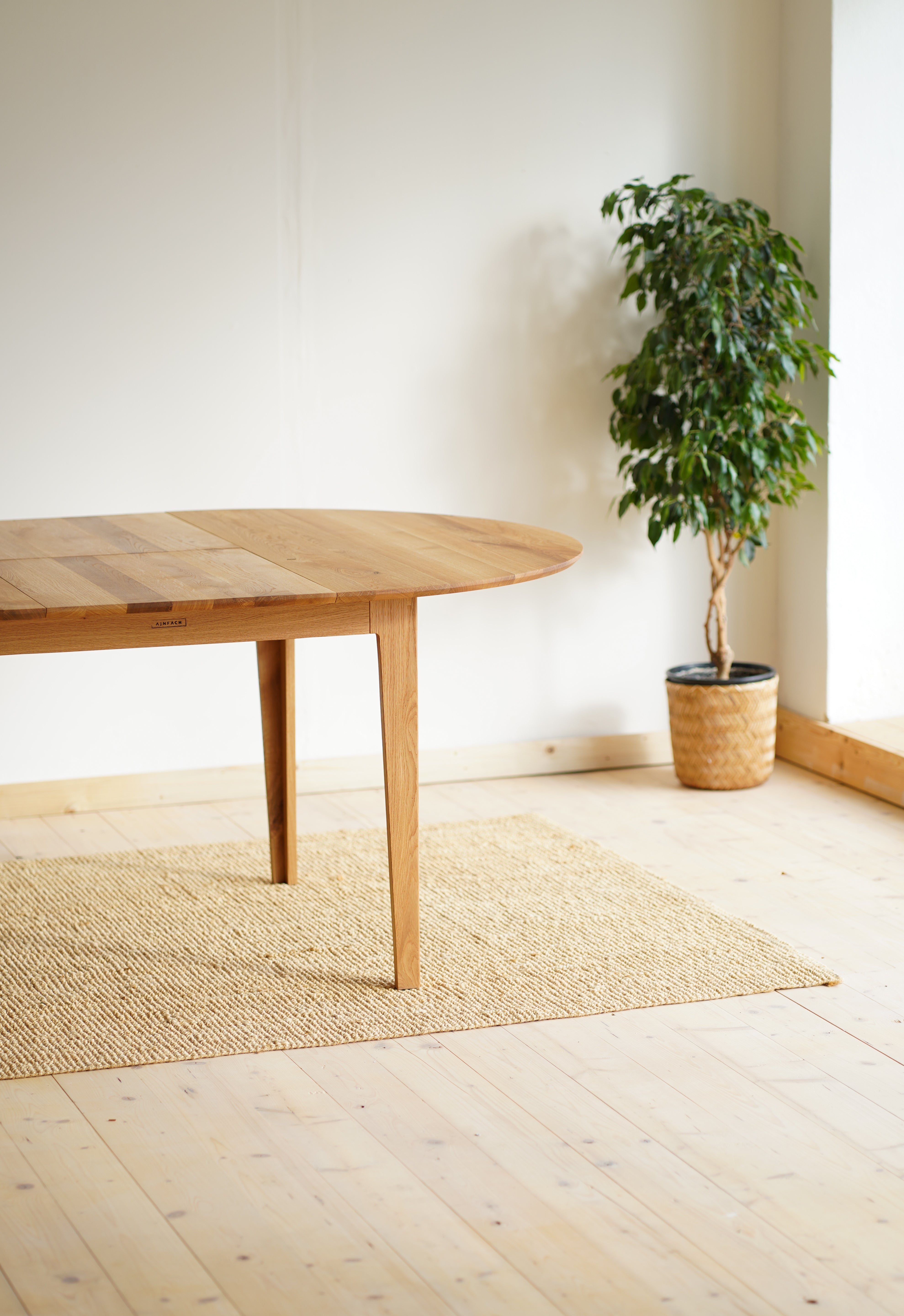 Bezbarvý, přírodní voskový olej zvýrazňuje estetickou kresbu dřeva a snadnou údržbu. Kulatý tvar desky přináší čistotu a estetiku, díky které krása tohoto stolu ještě více vynikne.