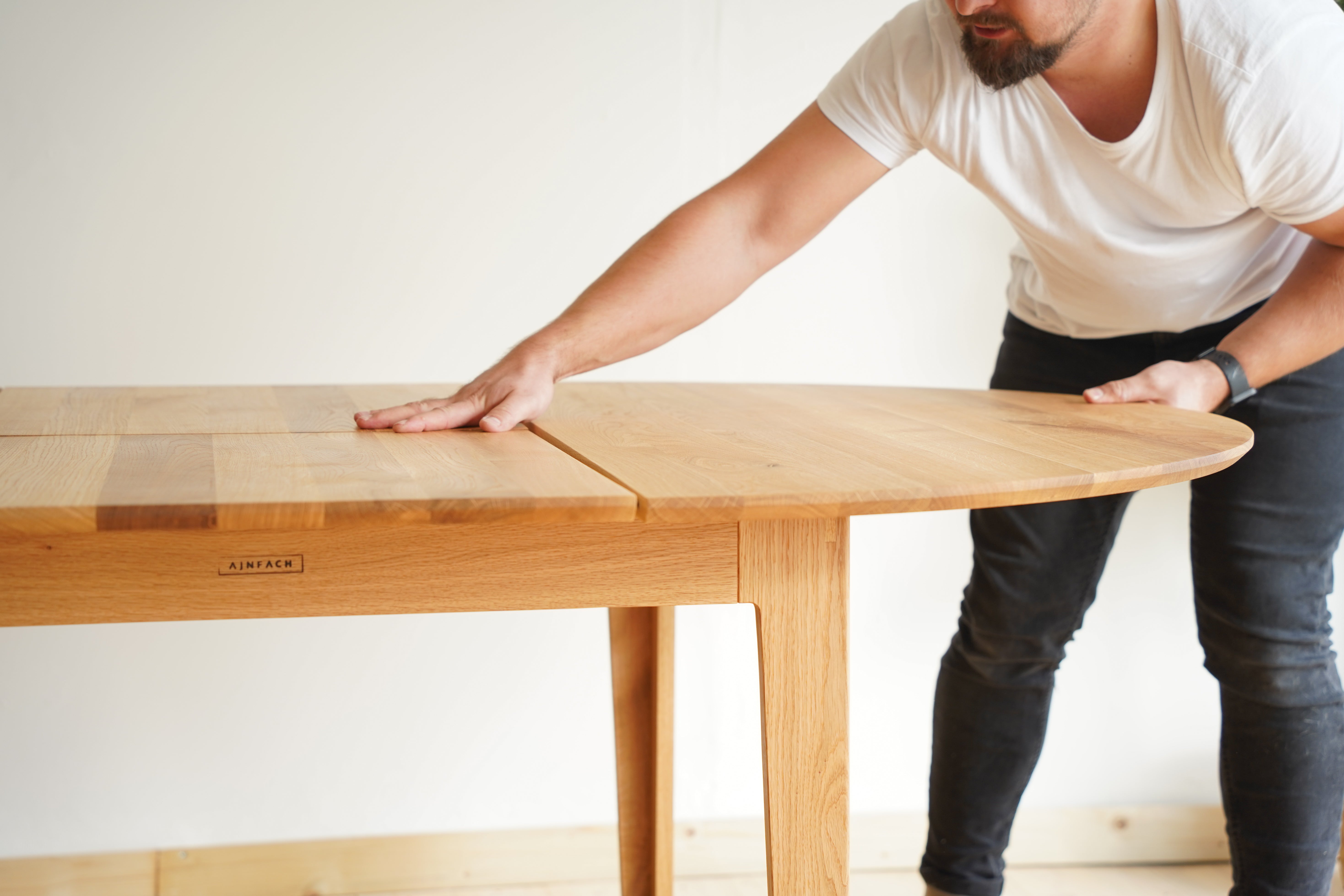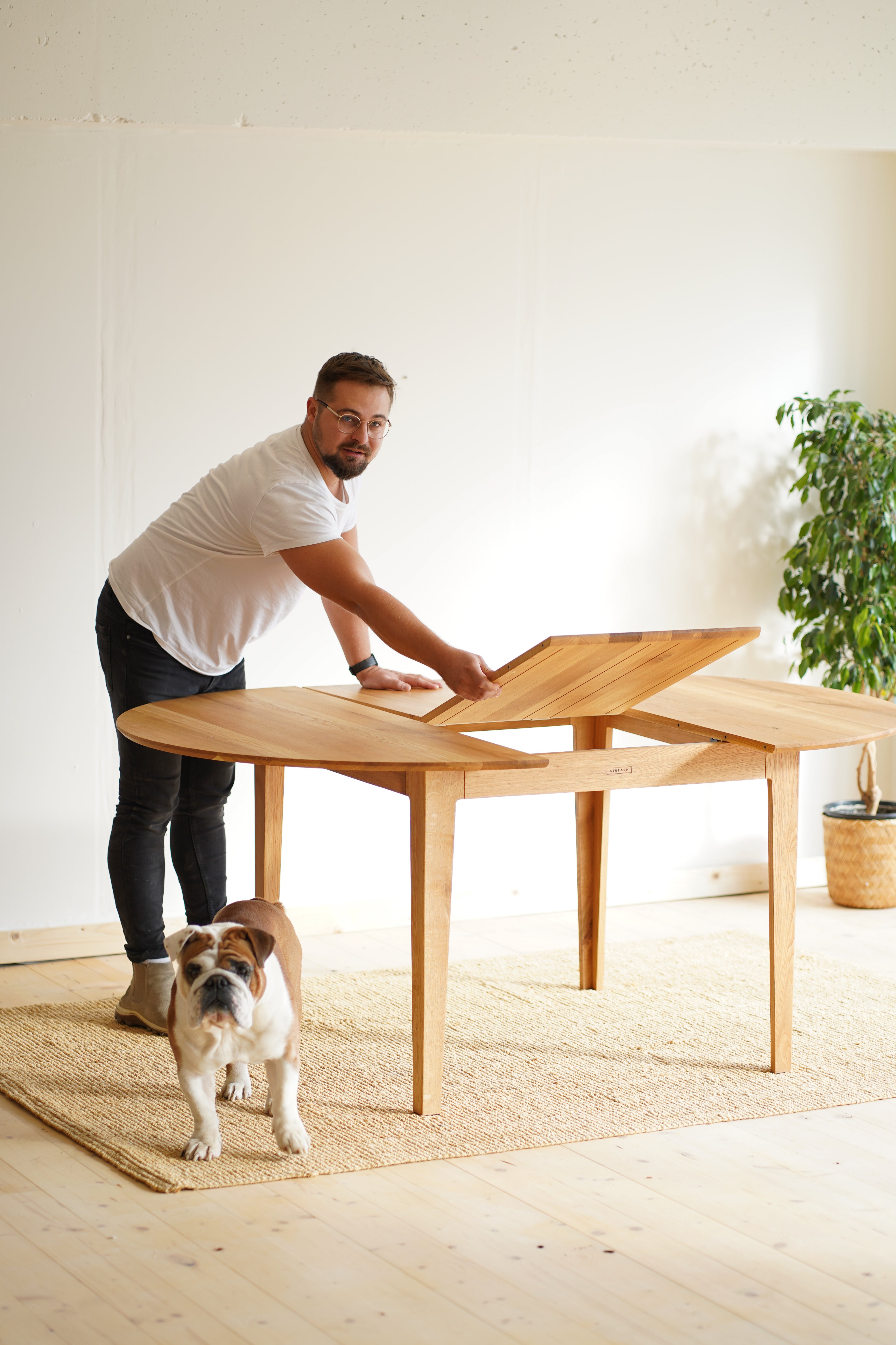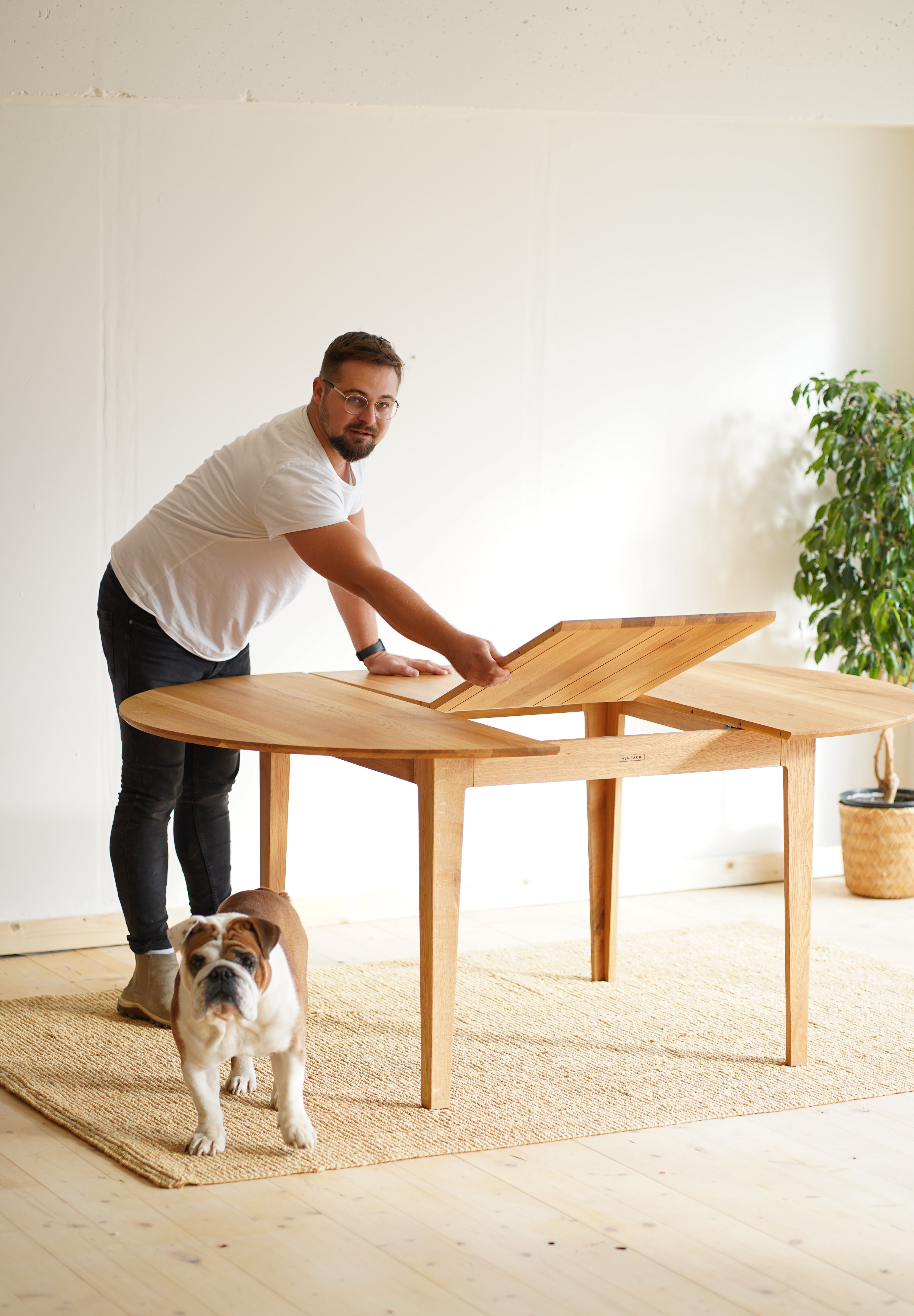 Skrytý výsuvný systém umožňuje stůl rozložit a přidat další masivní desku.