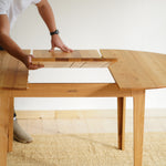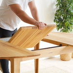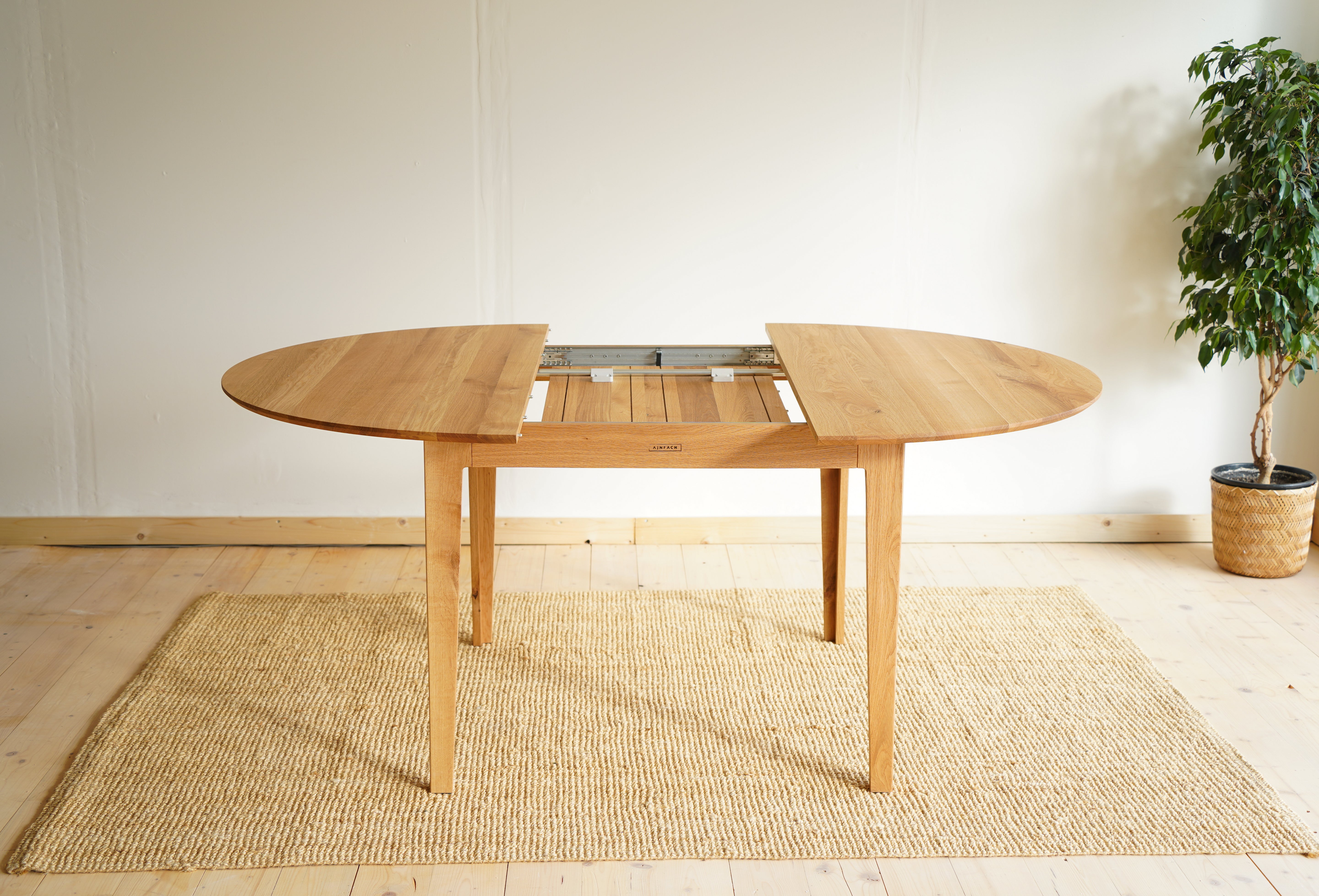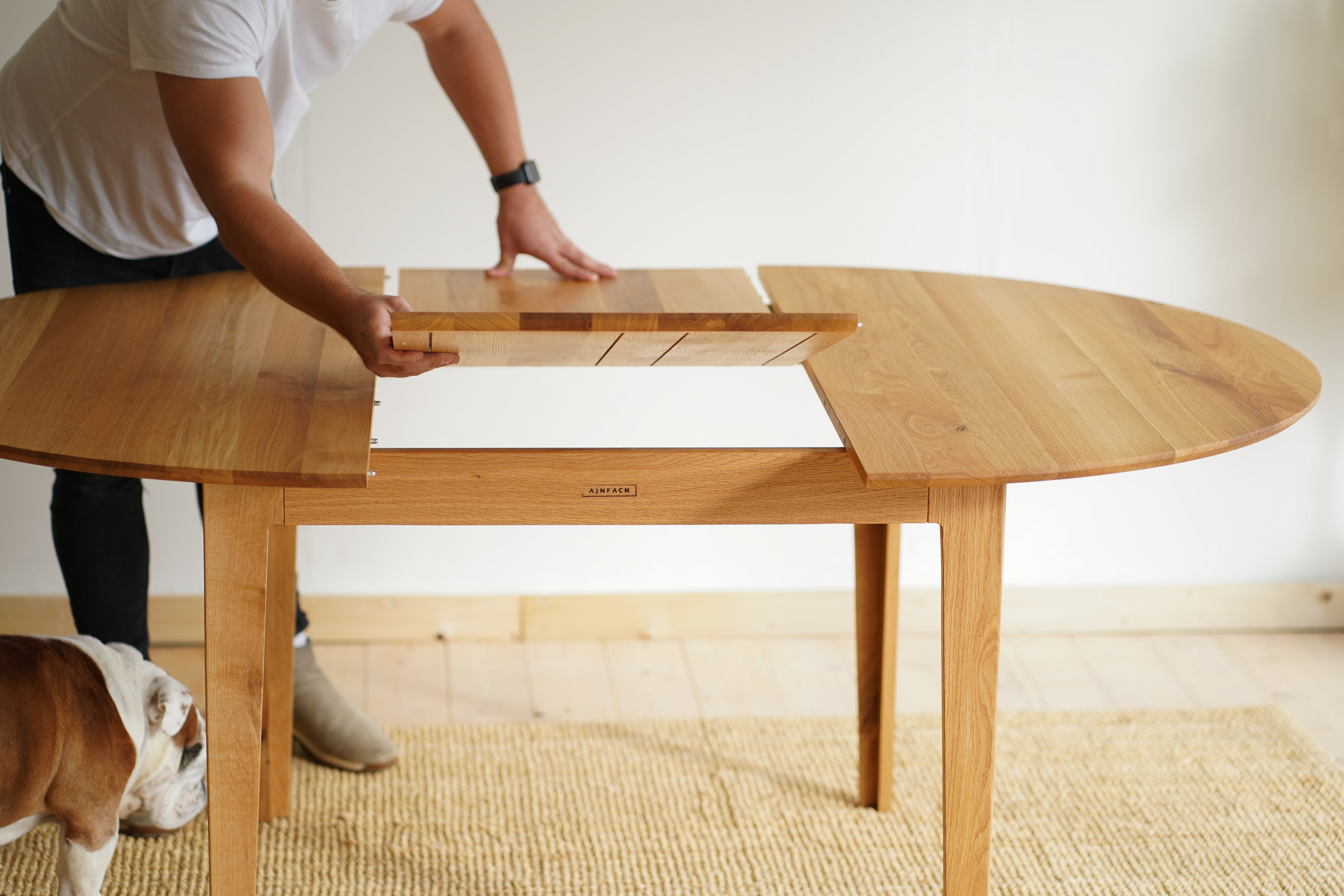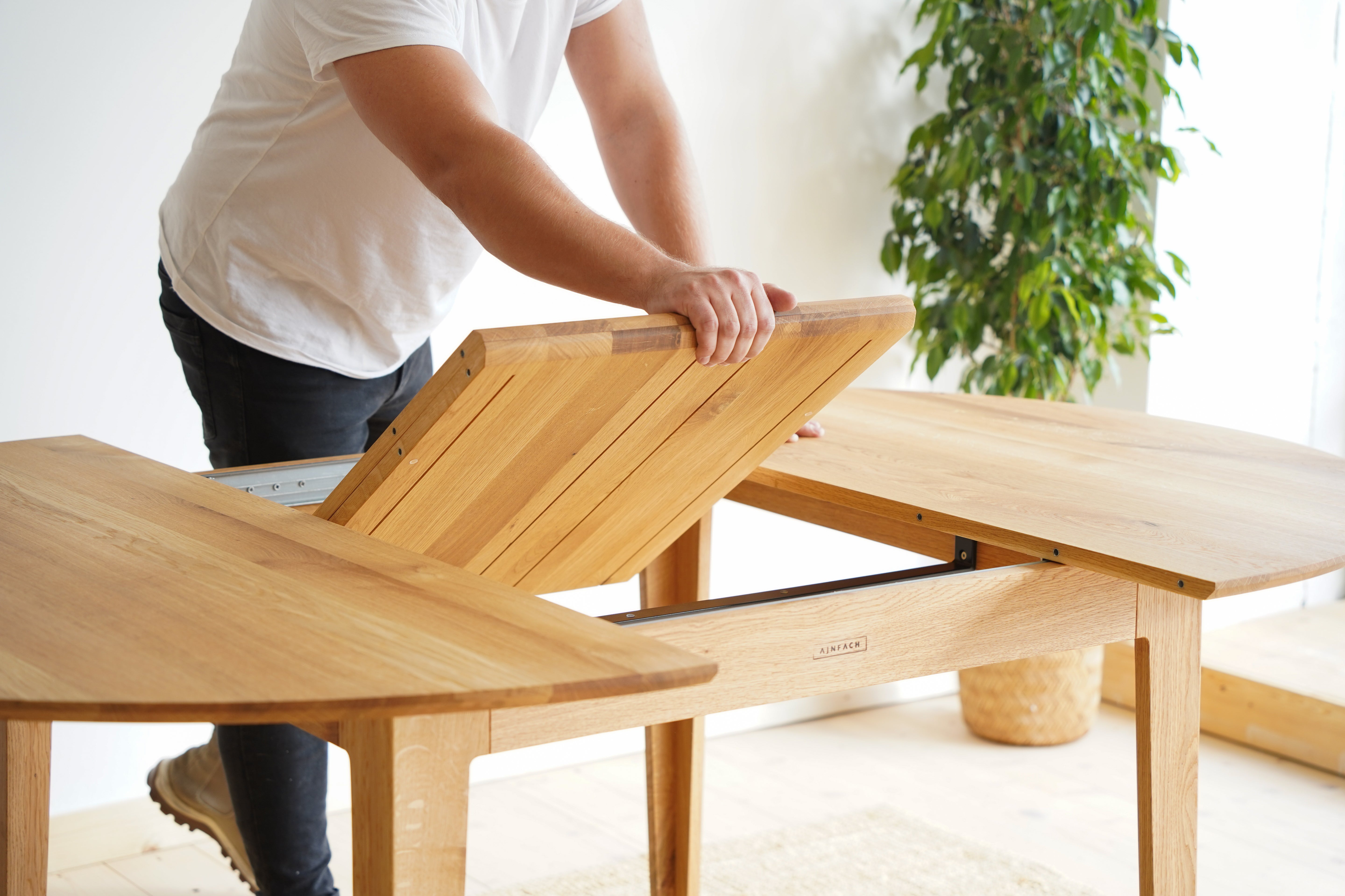 Skrytý výsuvný systém umožňuje stůl rozložit a přidat další masivní desku.