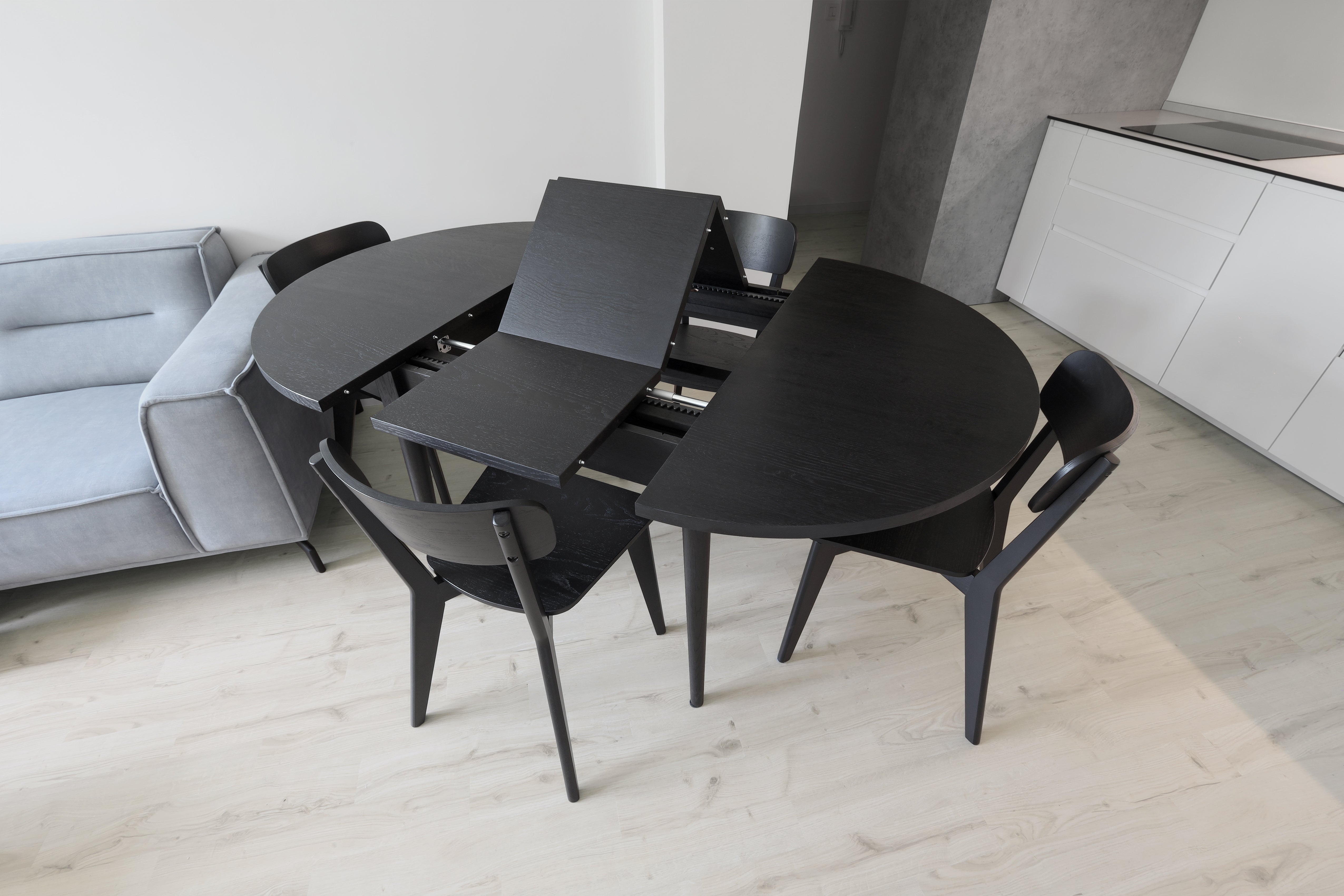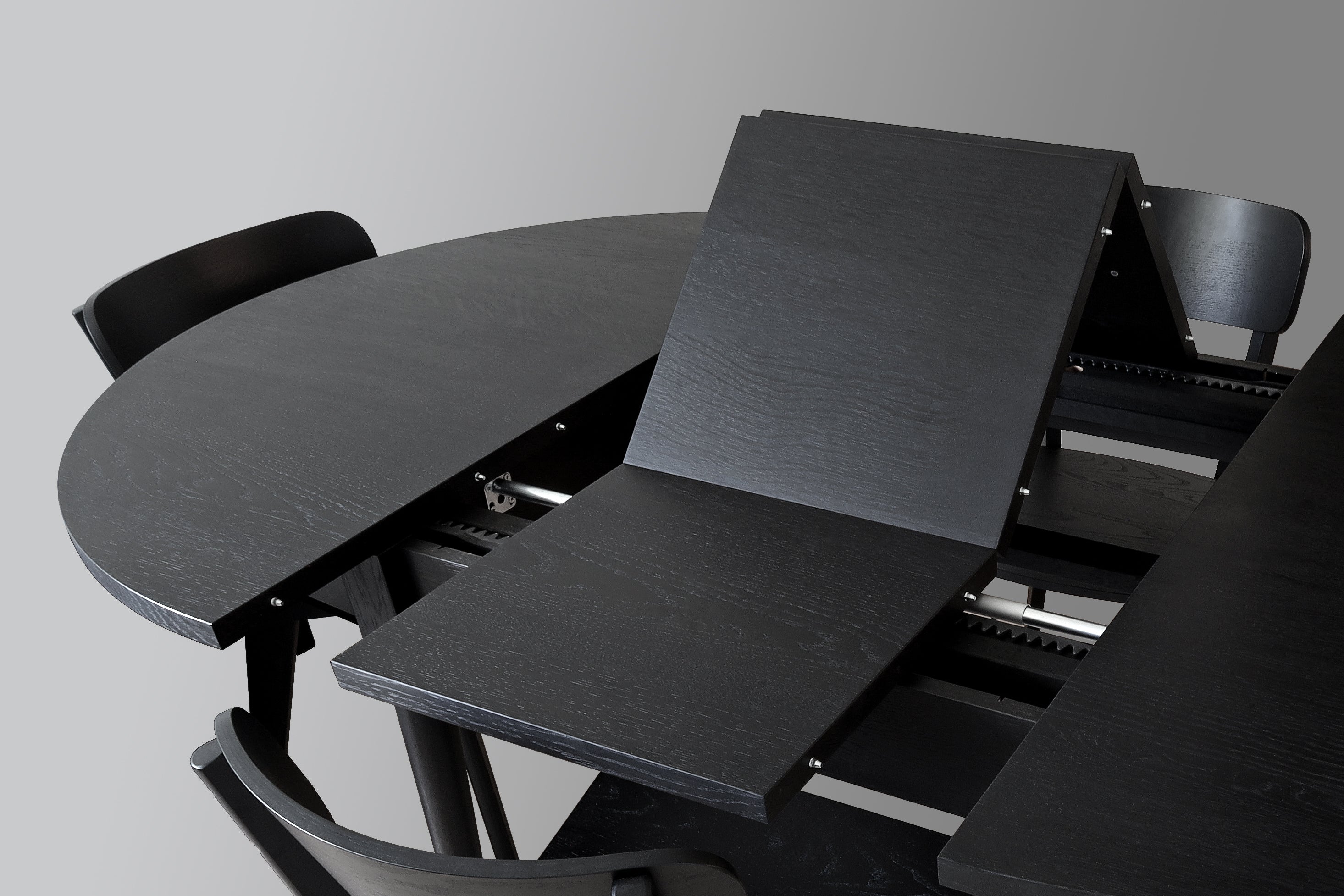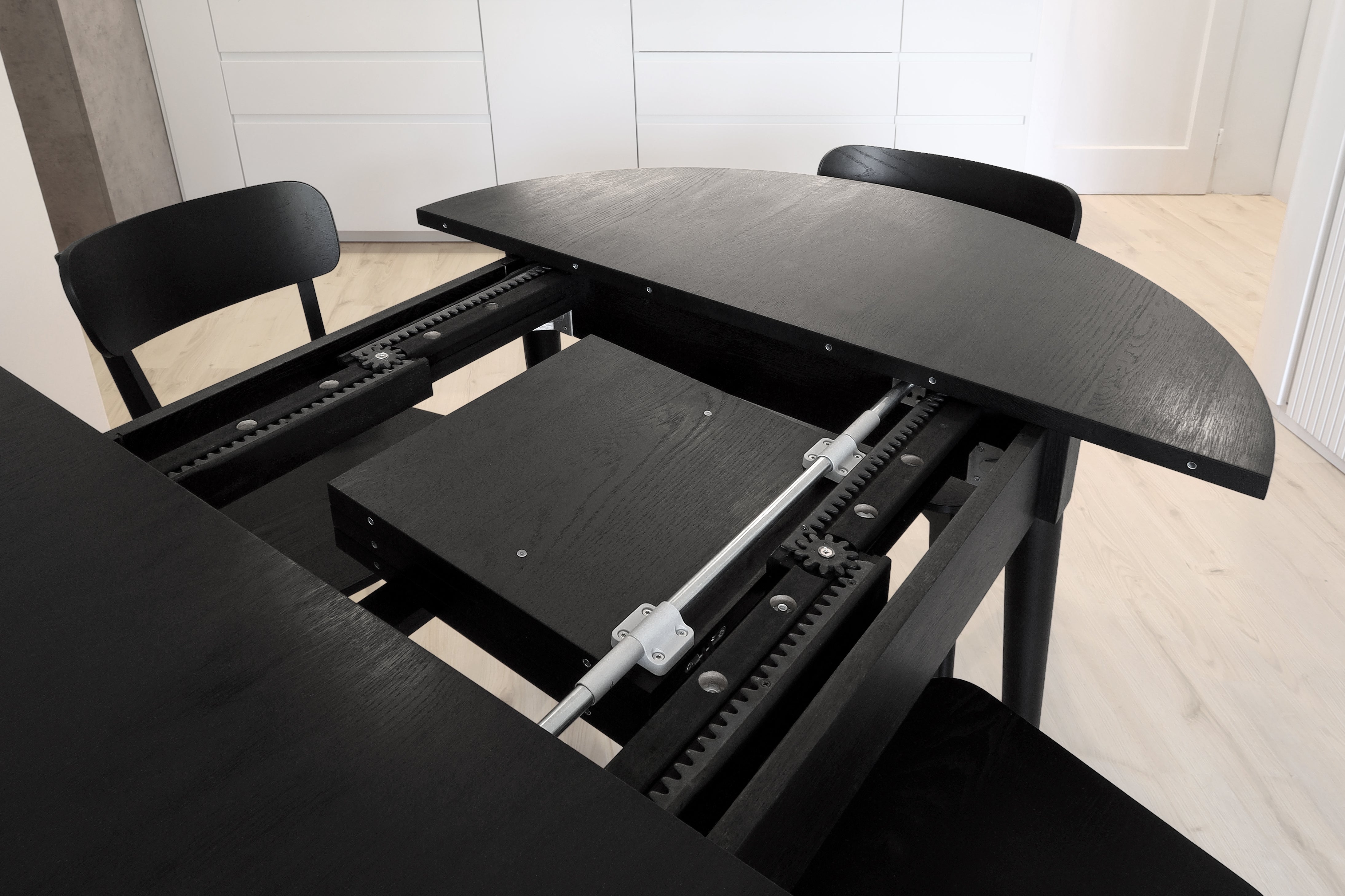 Skrytý rozkladací mechanizmus z dubového dreva je jednoduchý na použitie a pár ťahmi dokáže zväčšiť rozmery stola k klasického na robustný. Nohy z pevného dubového masívu sa starajú o dokonalú stabilitu a svojim umiestnením zaručujú dostatok priestoru pre všetkých stolujúcich.