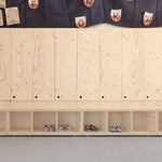 Kombinovaná skříňka, která nezabírá moc místa a dobře vypadá. Díky kombinaci velkých a malých uzavíratelných skříněk s pomalým dojezdem a vyjímatelnou lavičkou k sezení vznikl unikátní a designový šatní systém.