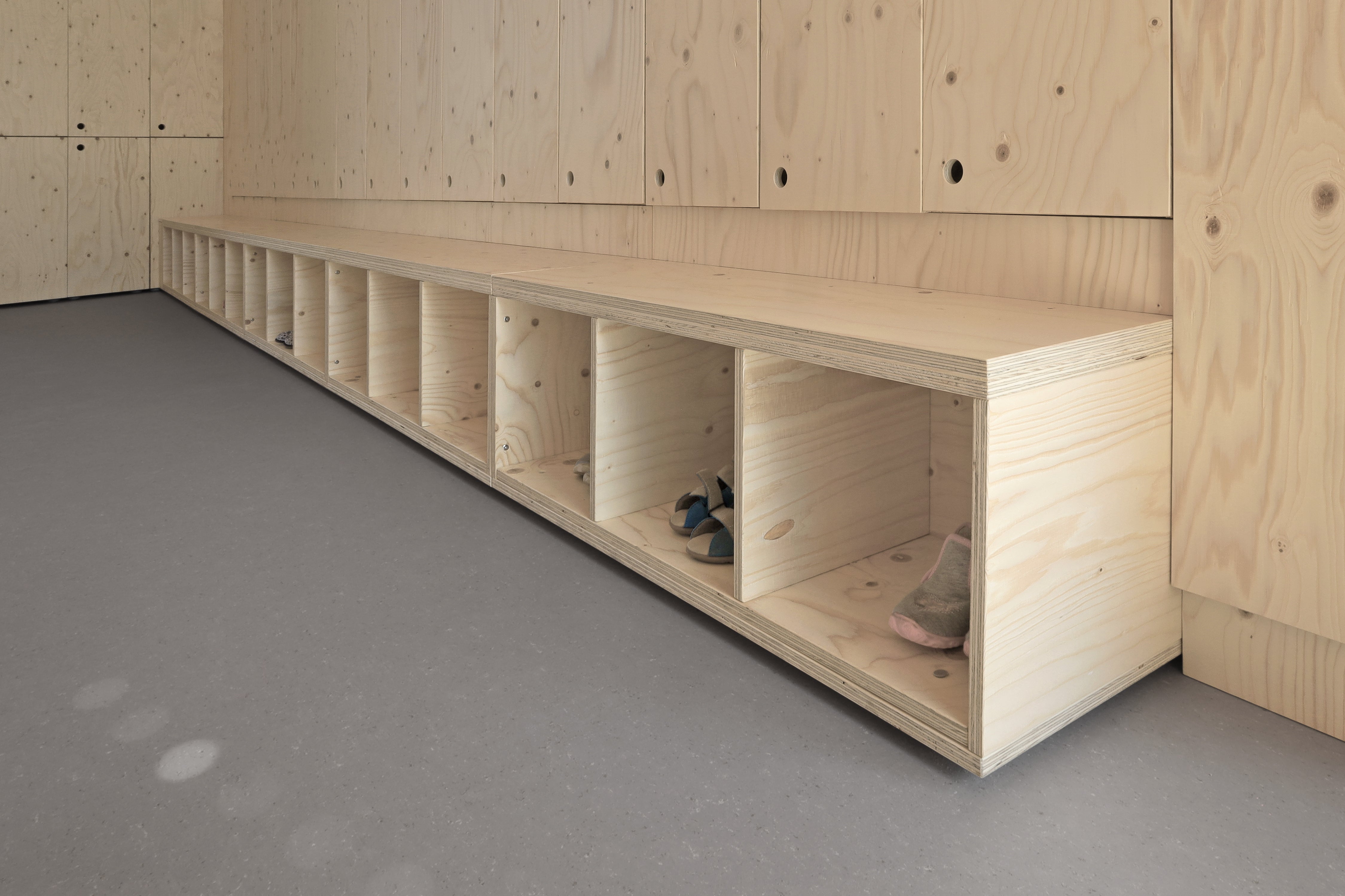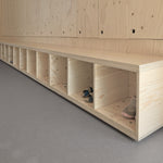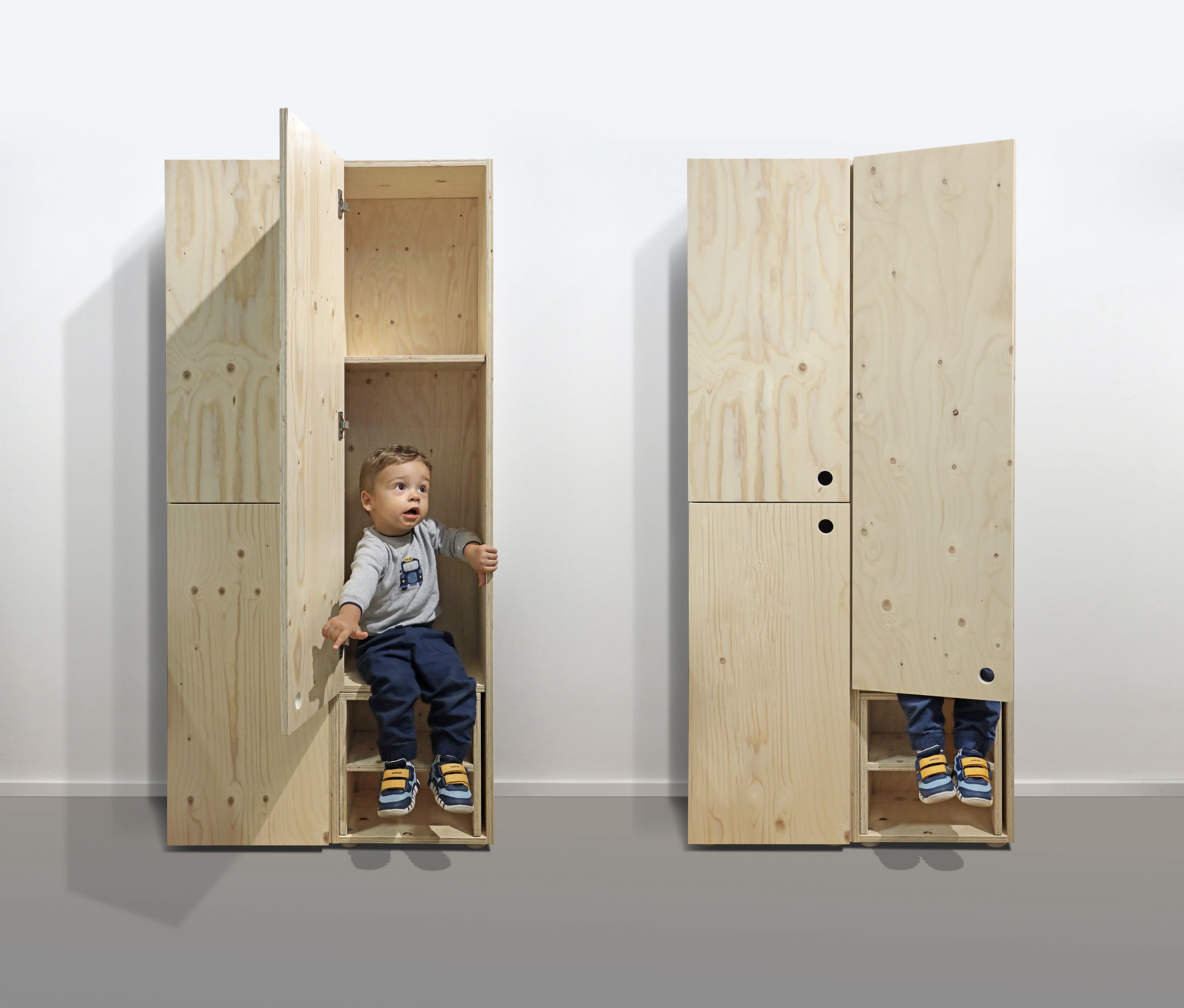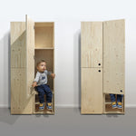 Šatní skříňka, která je vlastně mnohem víc. Jedná se o multifunkční systém velké a malé skříňky s vysouvatelnou lavičkou, které jsou umně a designově začleněny do sebe, takže vytvářejí kompaktní celek z vysoce kvalitní smrkové překližky.
